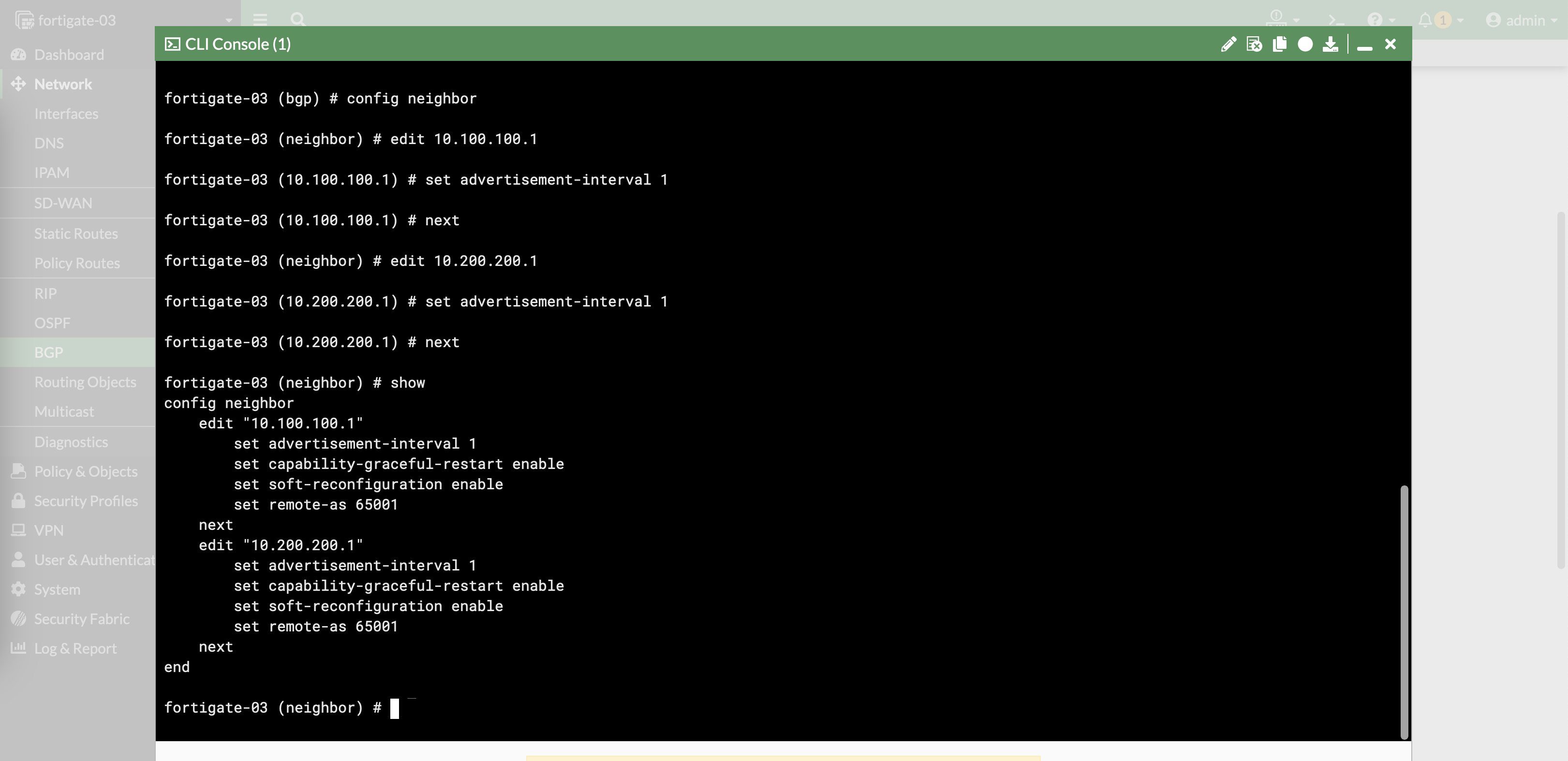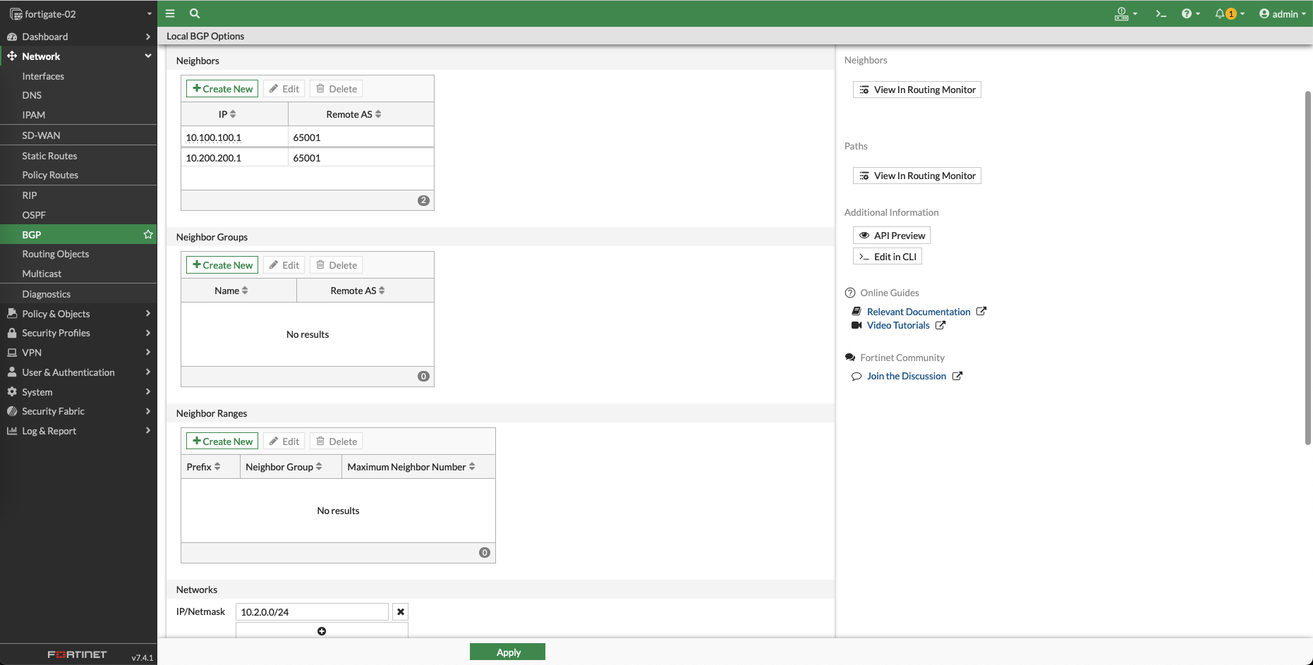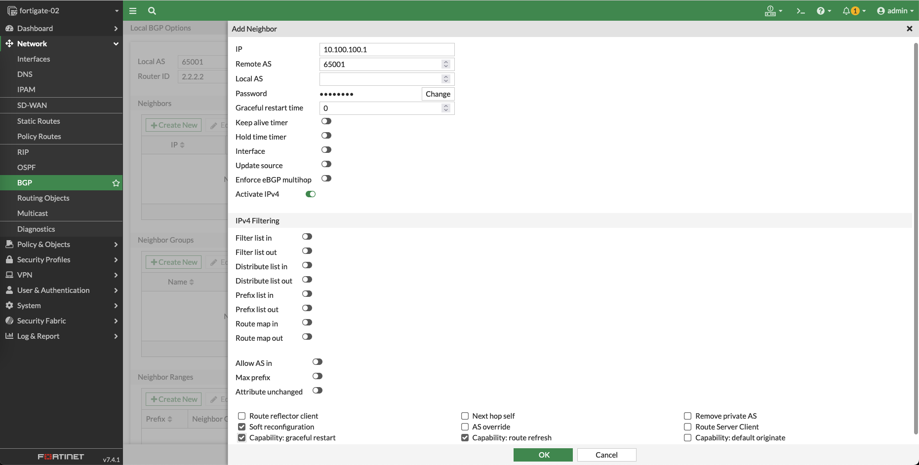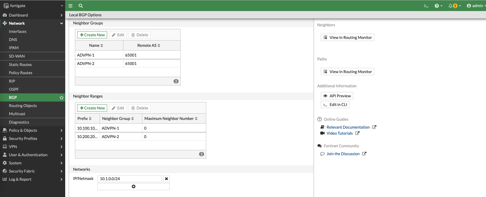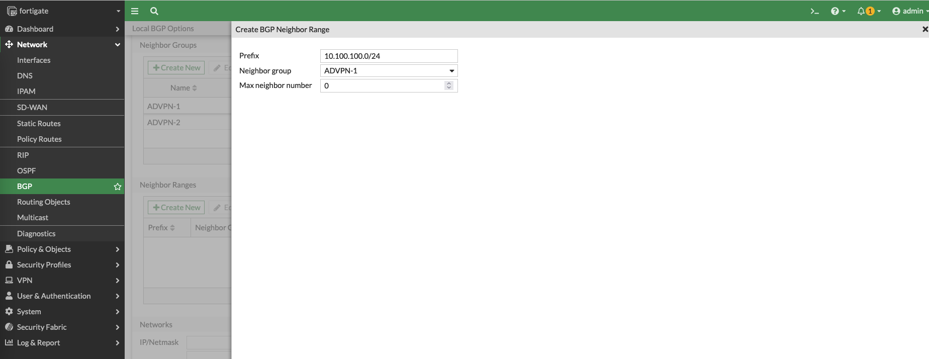 Next create a BGP Neighbor Range containing the network subnet of the VPN 1 interface