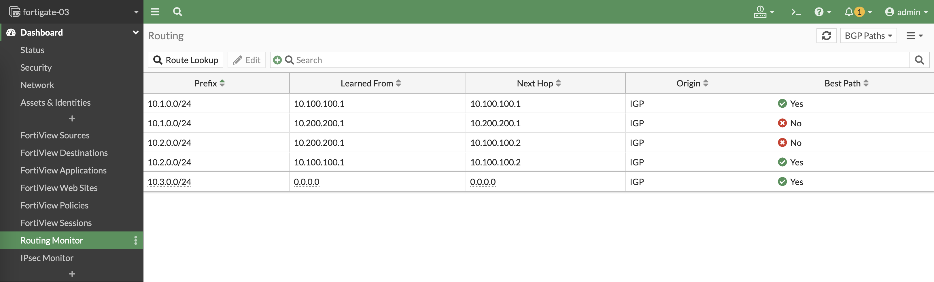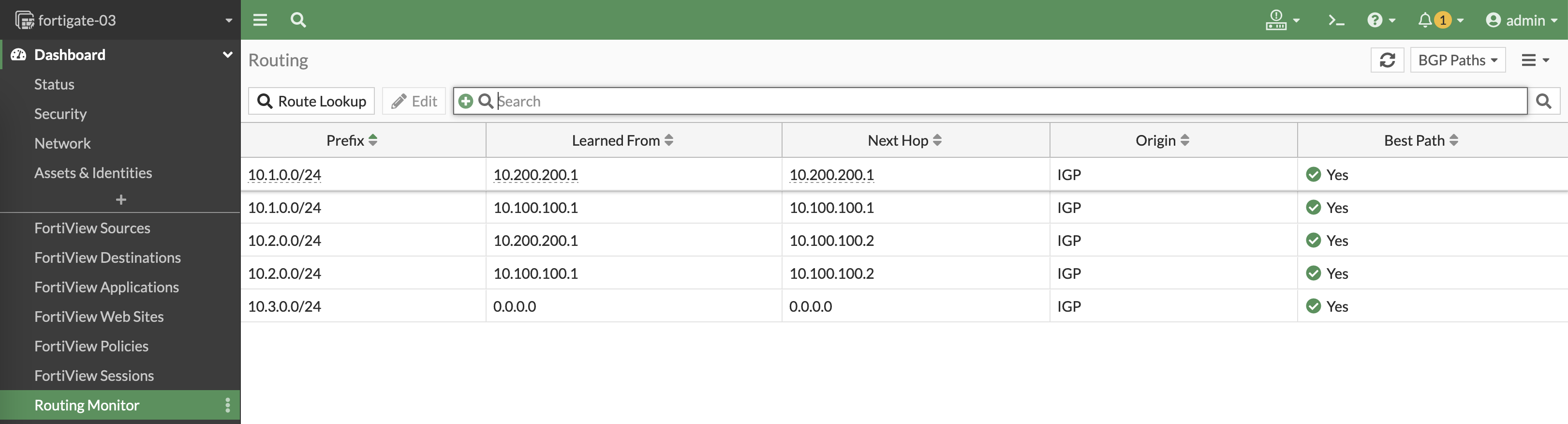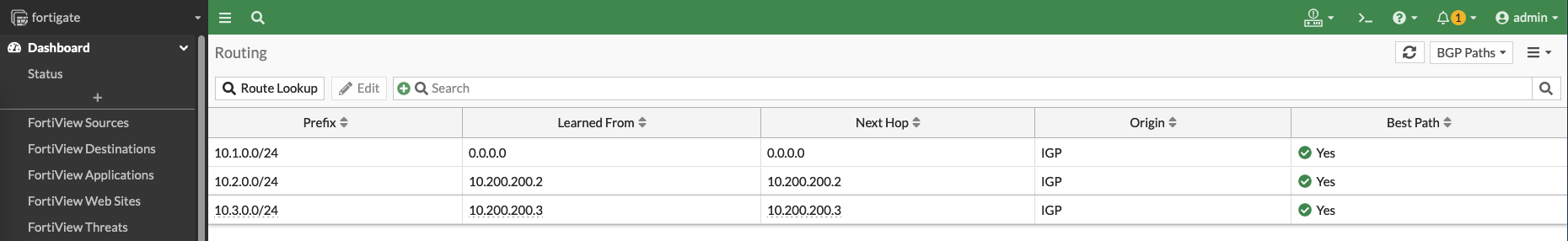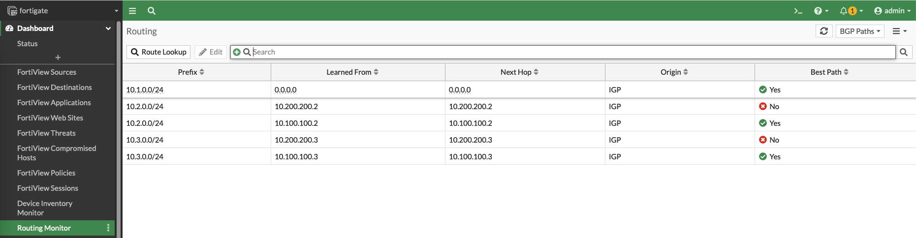 And on BGP Paths, we can also see the local subnets of the spokes being advertised by BGP