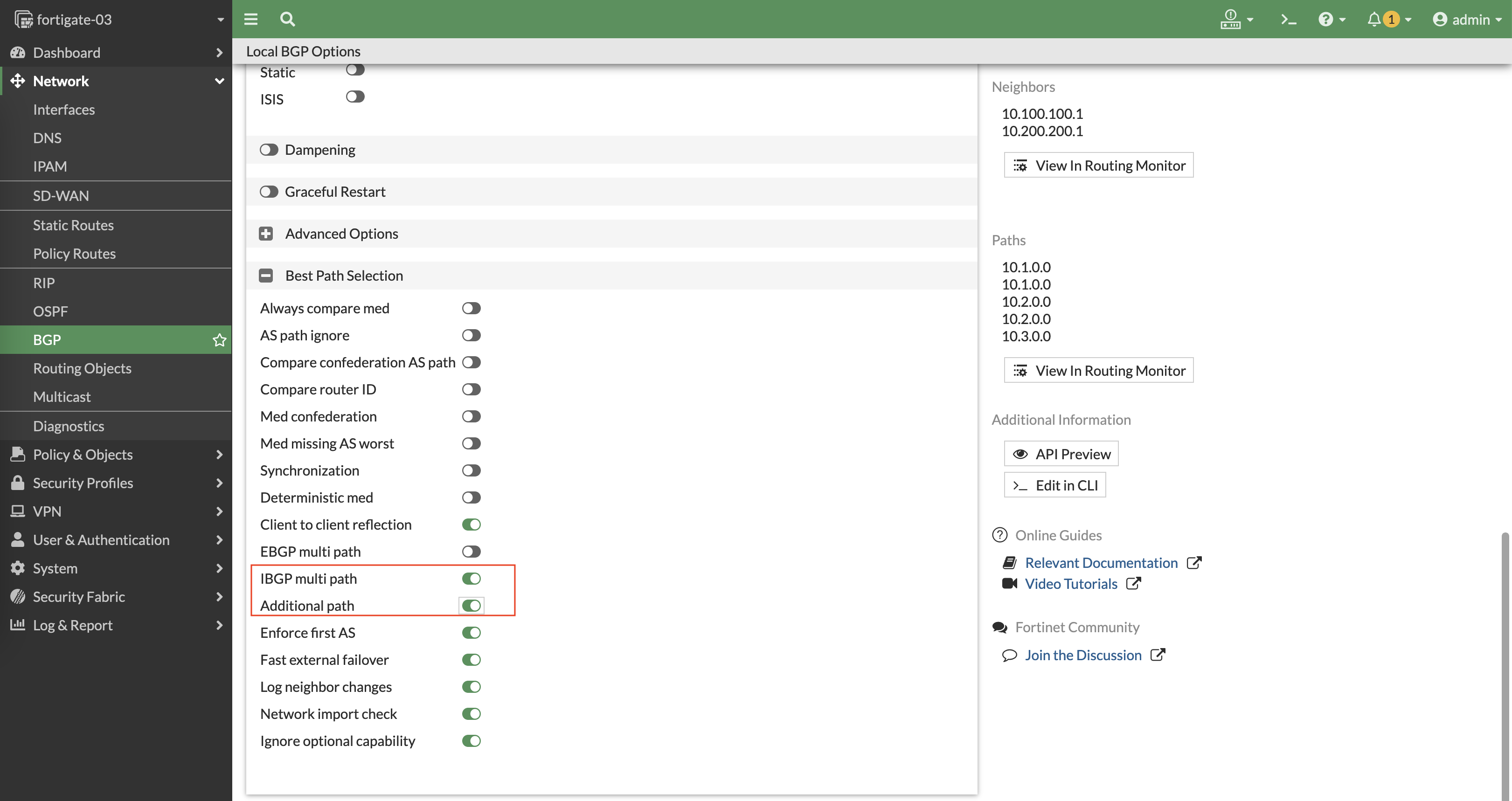 To enable ECMP, go to BGP configuration and enable IBGP Multipath and Additional Path