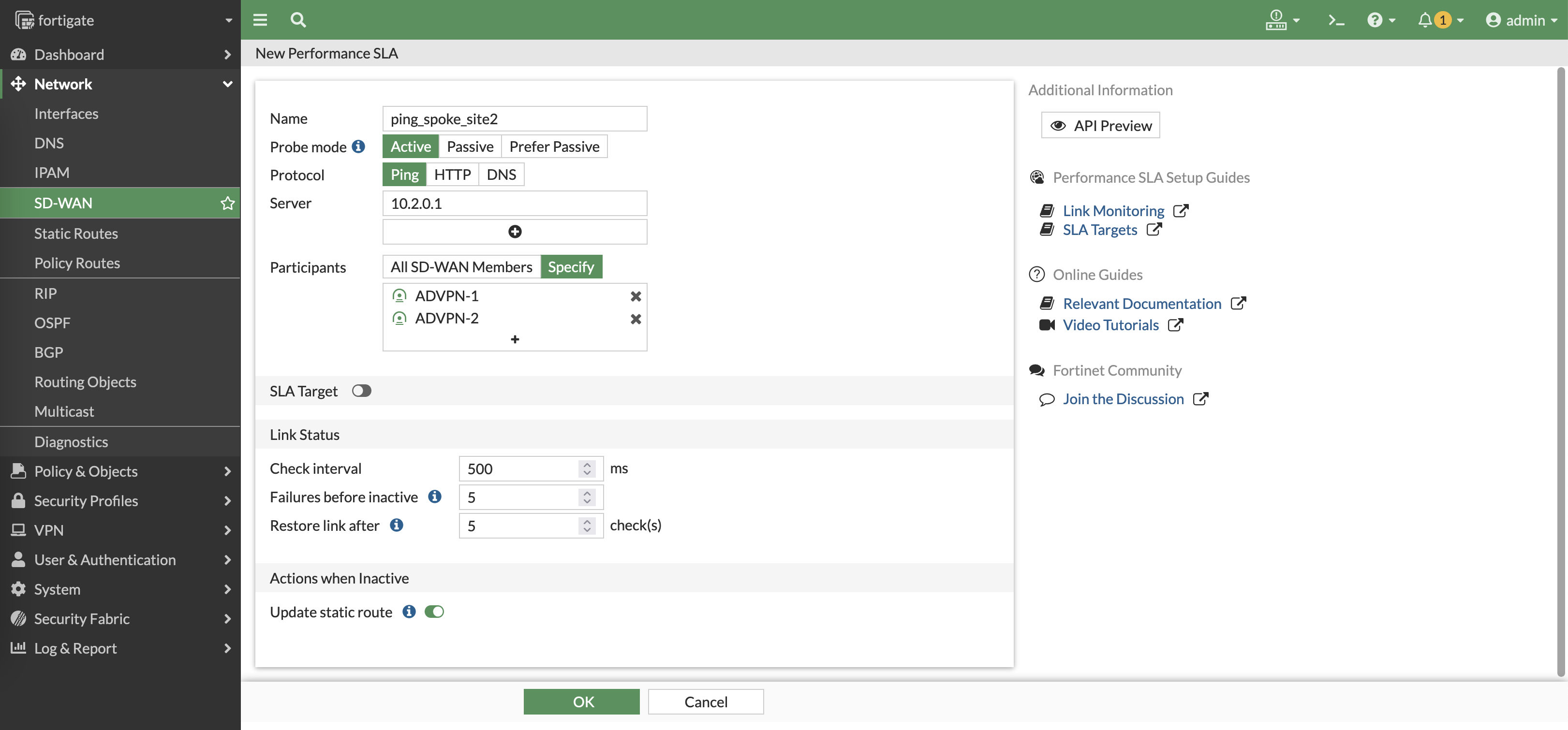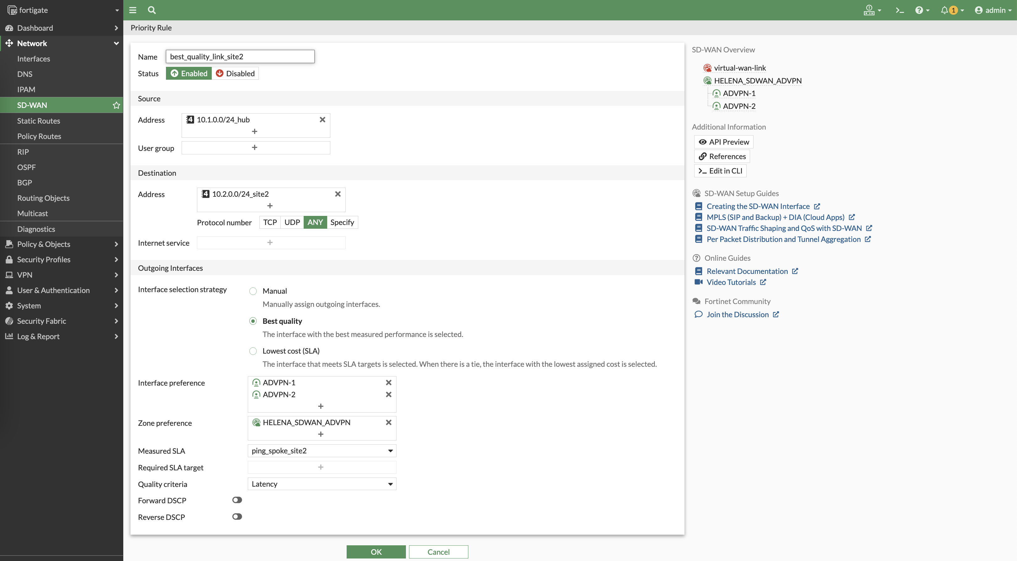 Next we create a new priority rule to utilize the performance SLA made to make judgement to use the lowest latency for the SD-WAN traffic to site 2