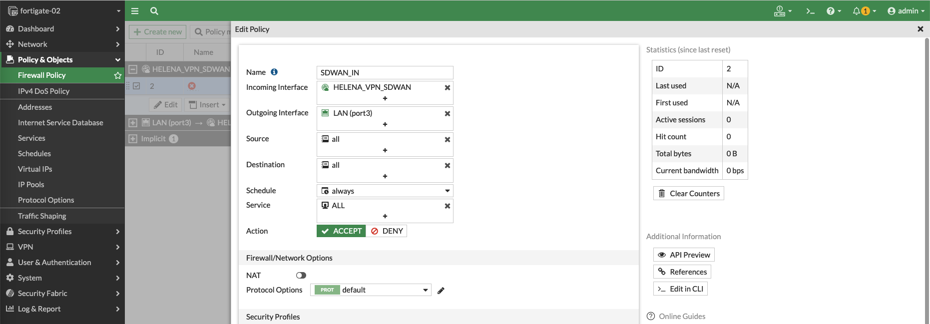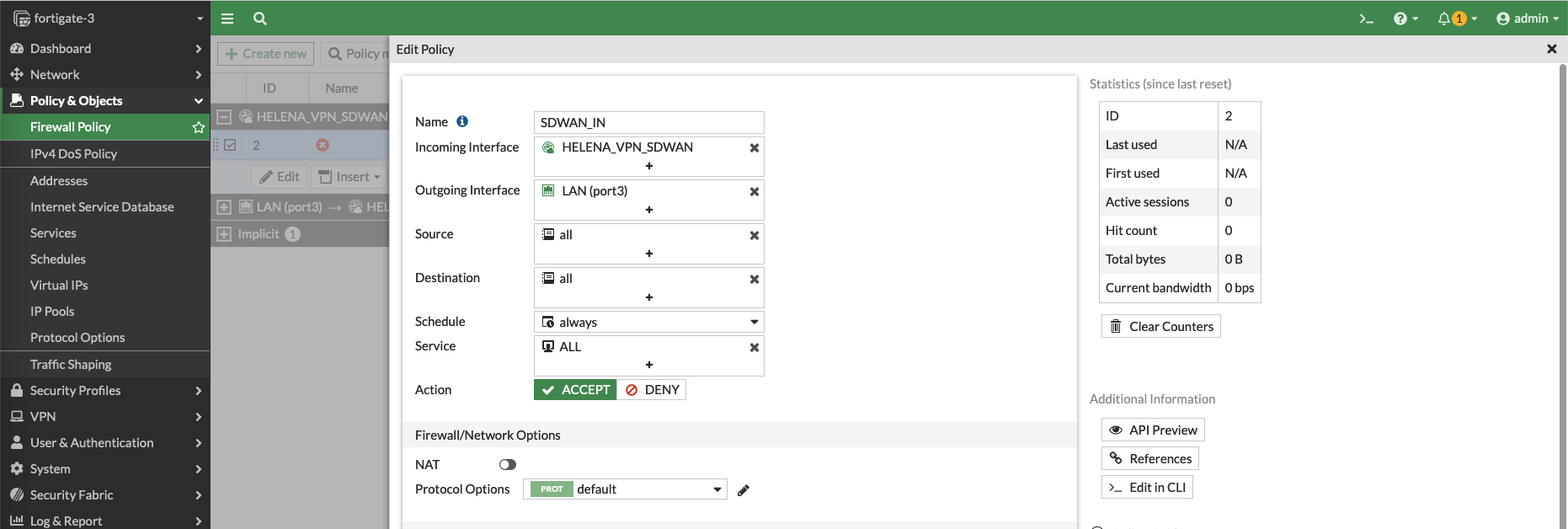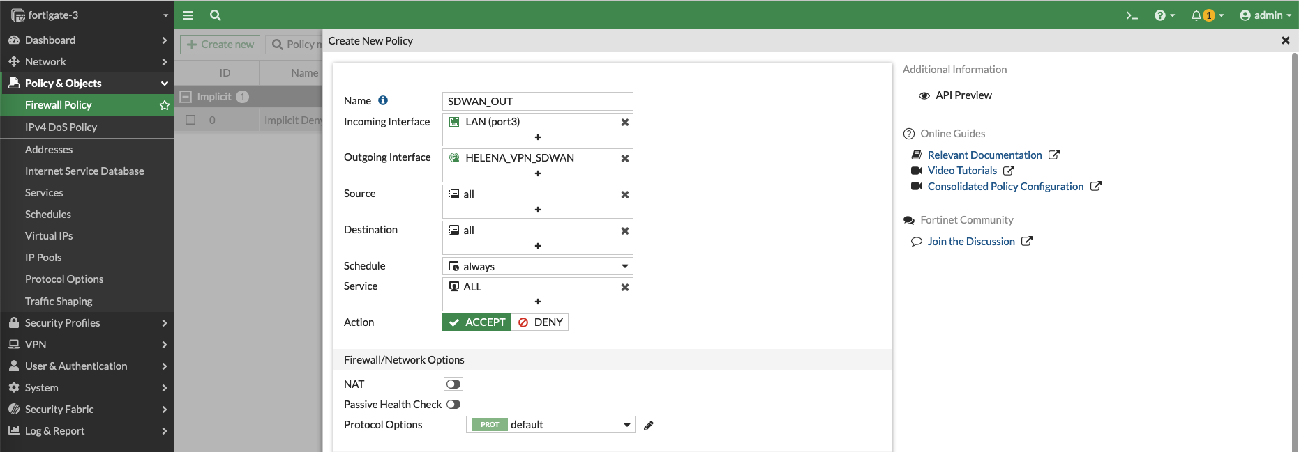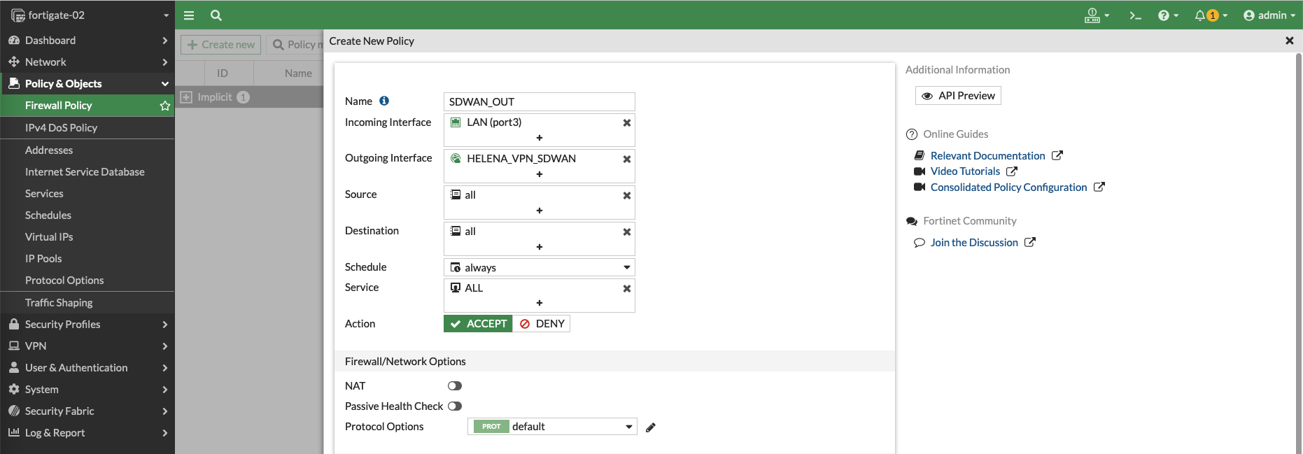 Next create a Firewall Policy to allow traffic going out to SD-WAN interface