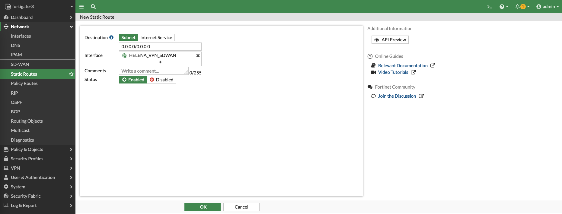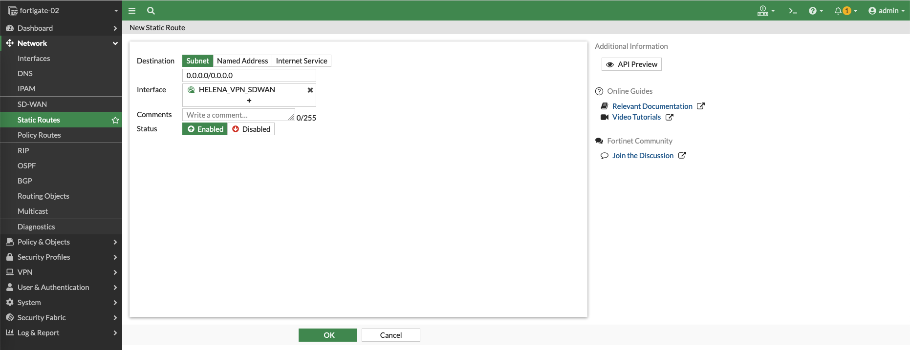 Lastly, add a route to go out using the SD-WAN interface
