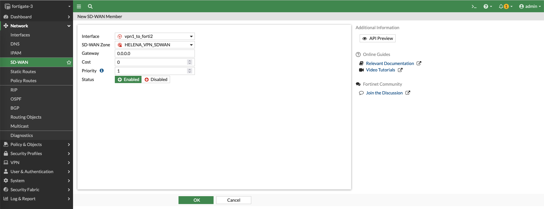 Then create a member of VPN 1 interface in the SD-WAN Zone