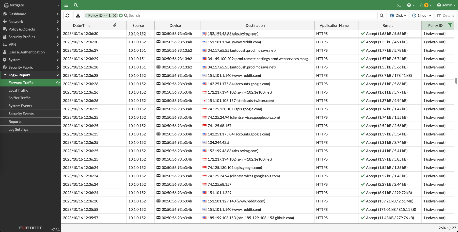 And back on the Fortigate, we can see the traffic flowing through the SD-WAN Interface