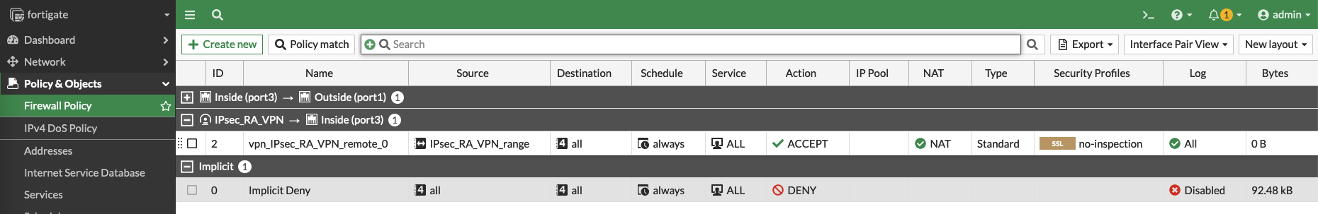 On Dashboard » IPsec Monitor, we can see the connected VPN client
