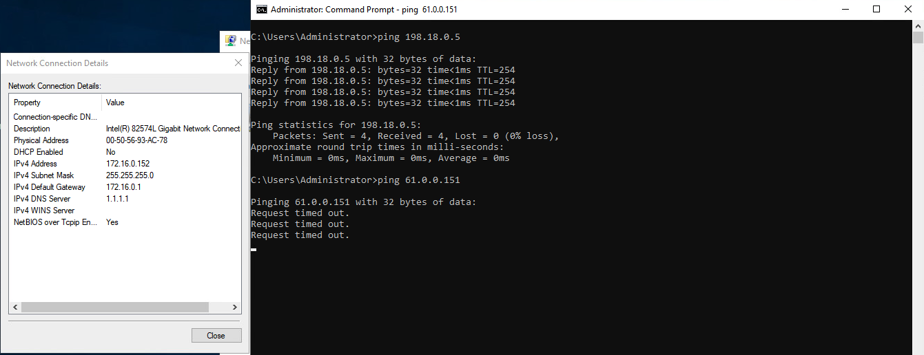 On this client PC, we have a connection to the Forti’s WAN IP but not the inside segment
