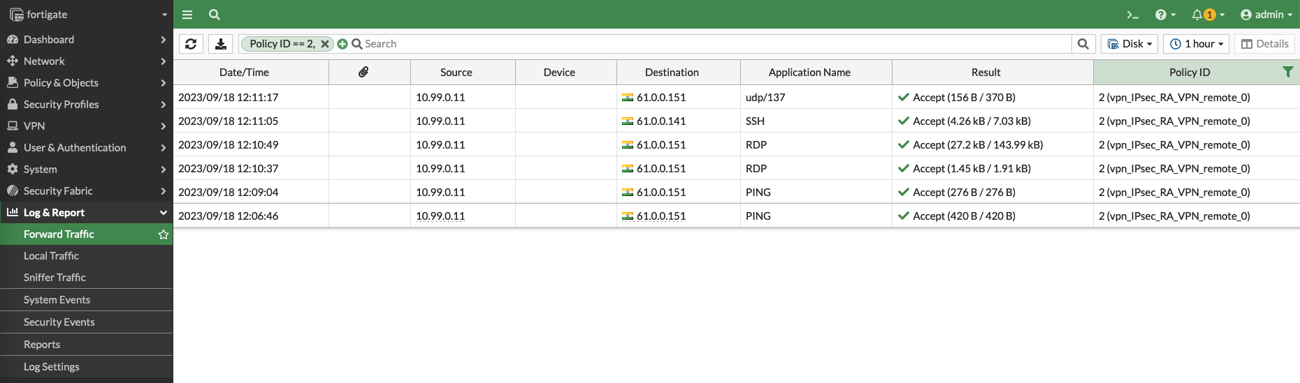 And on Log & Report » Forward Traffic, we can see all the traffic flowing from the VPN client