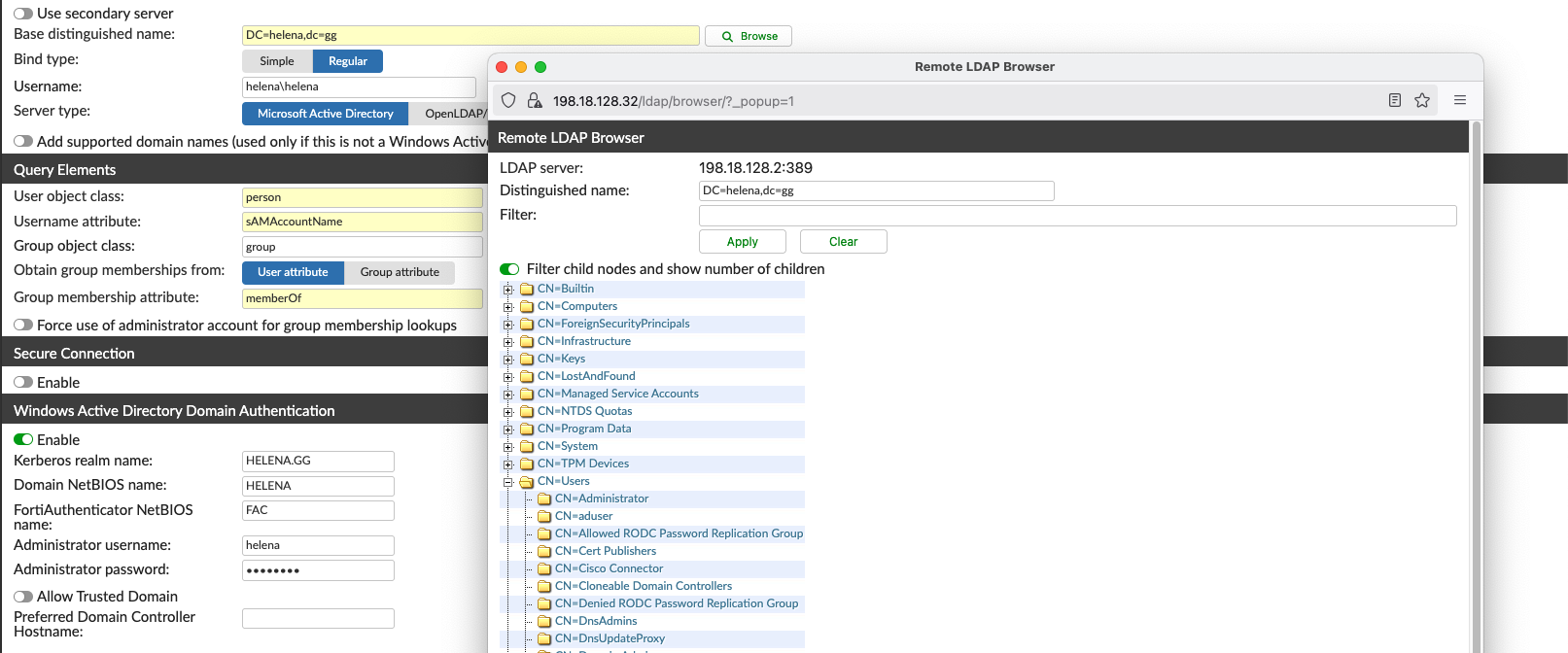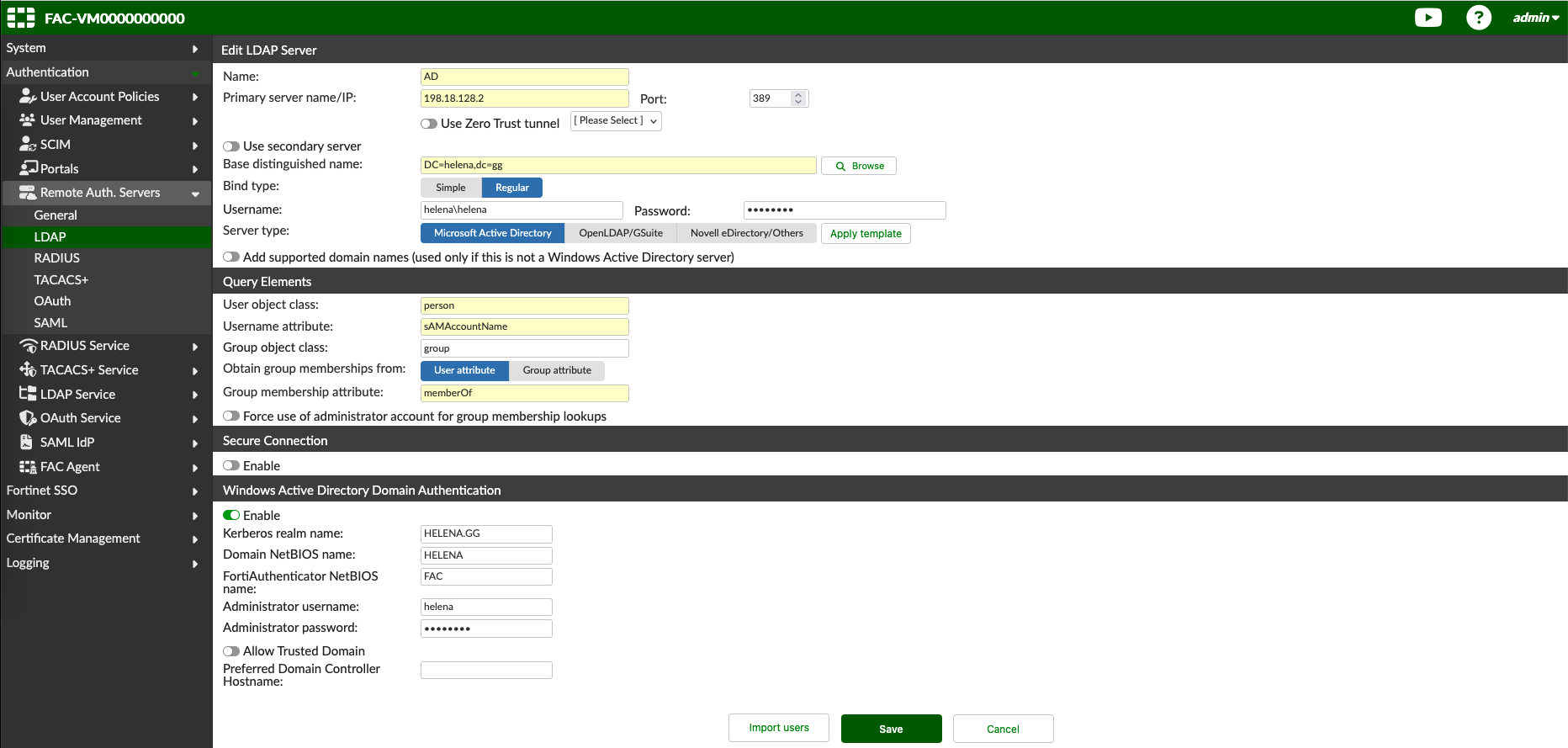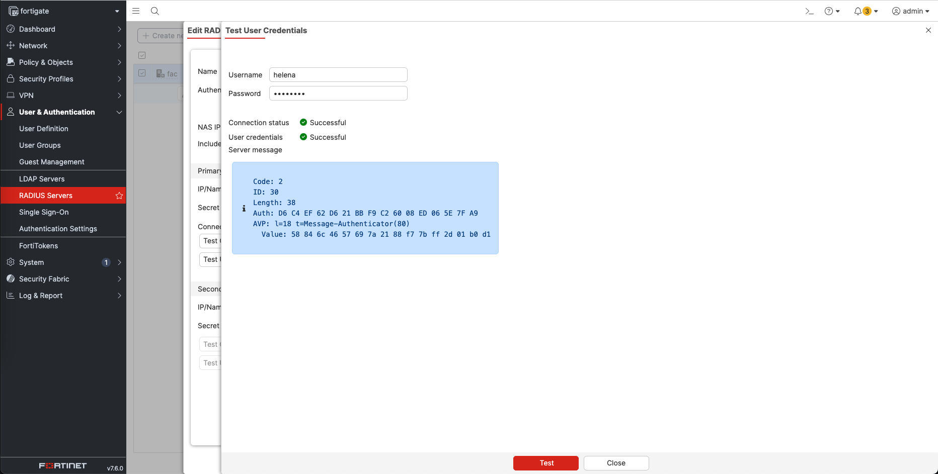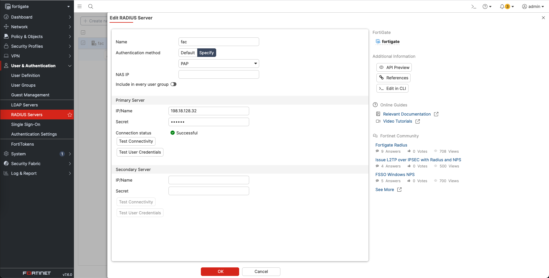On the Fortigate side, we add a new Radius Server pointing to the FortiAuthenticator