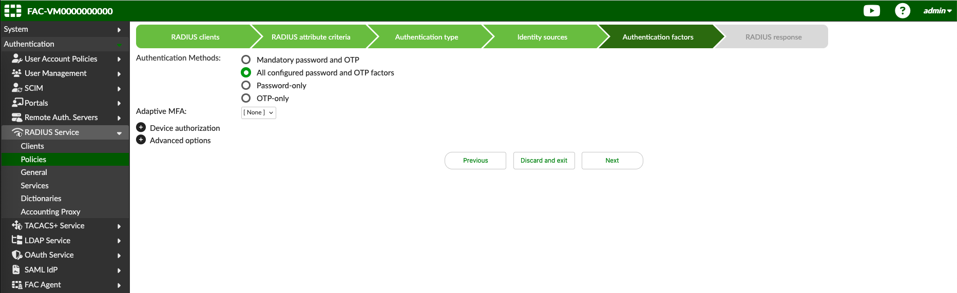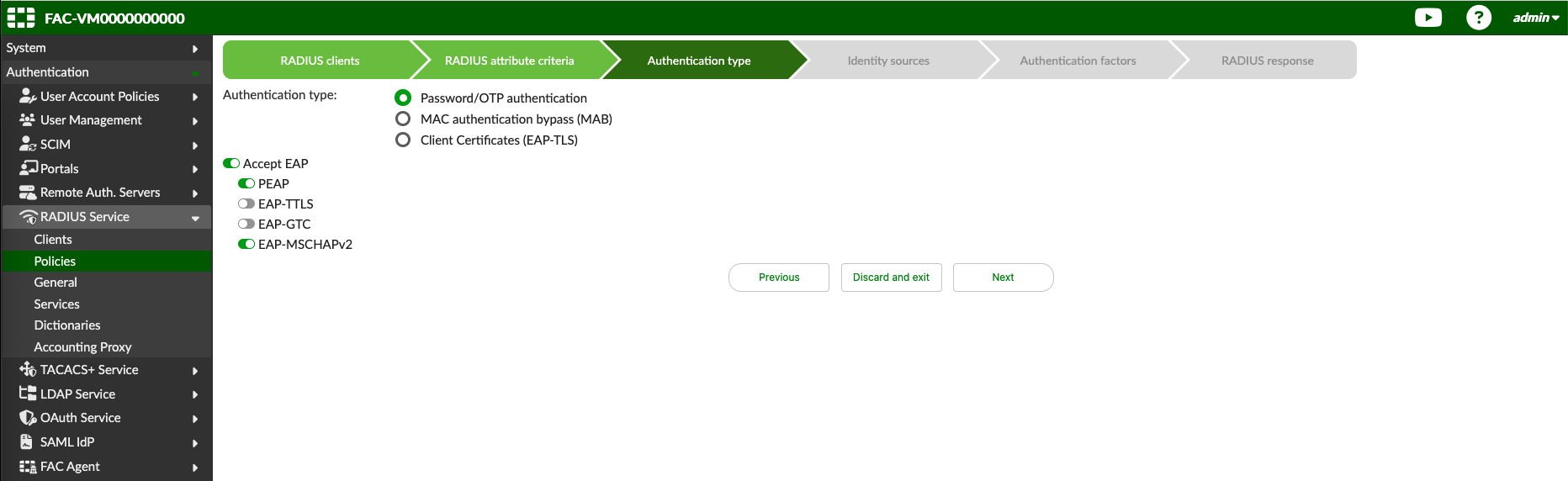 For authentication type, we stick with default Password/OTP and we enable some EAP protocols incase needed in the future