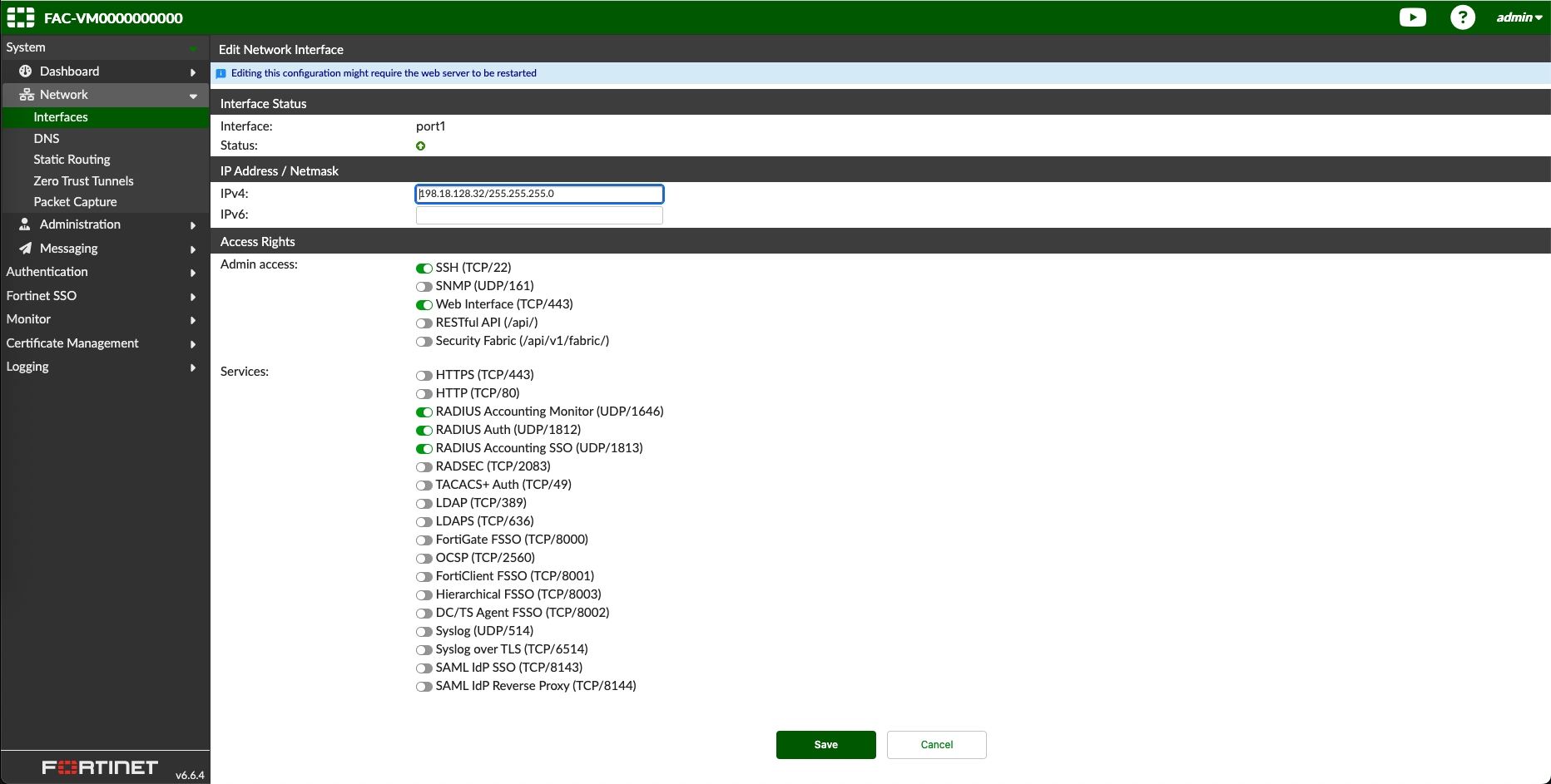 On FortiAuthenticator’s intefrace, make sure its able to receive Radius connections from fortigate