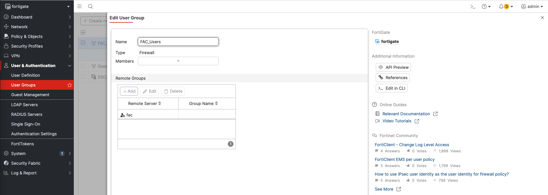 Next on Fortigate, create a new User Groups that points to the Radius Server created
