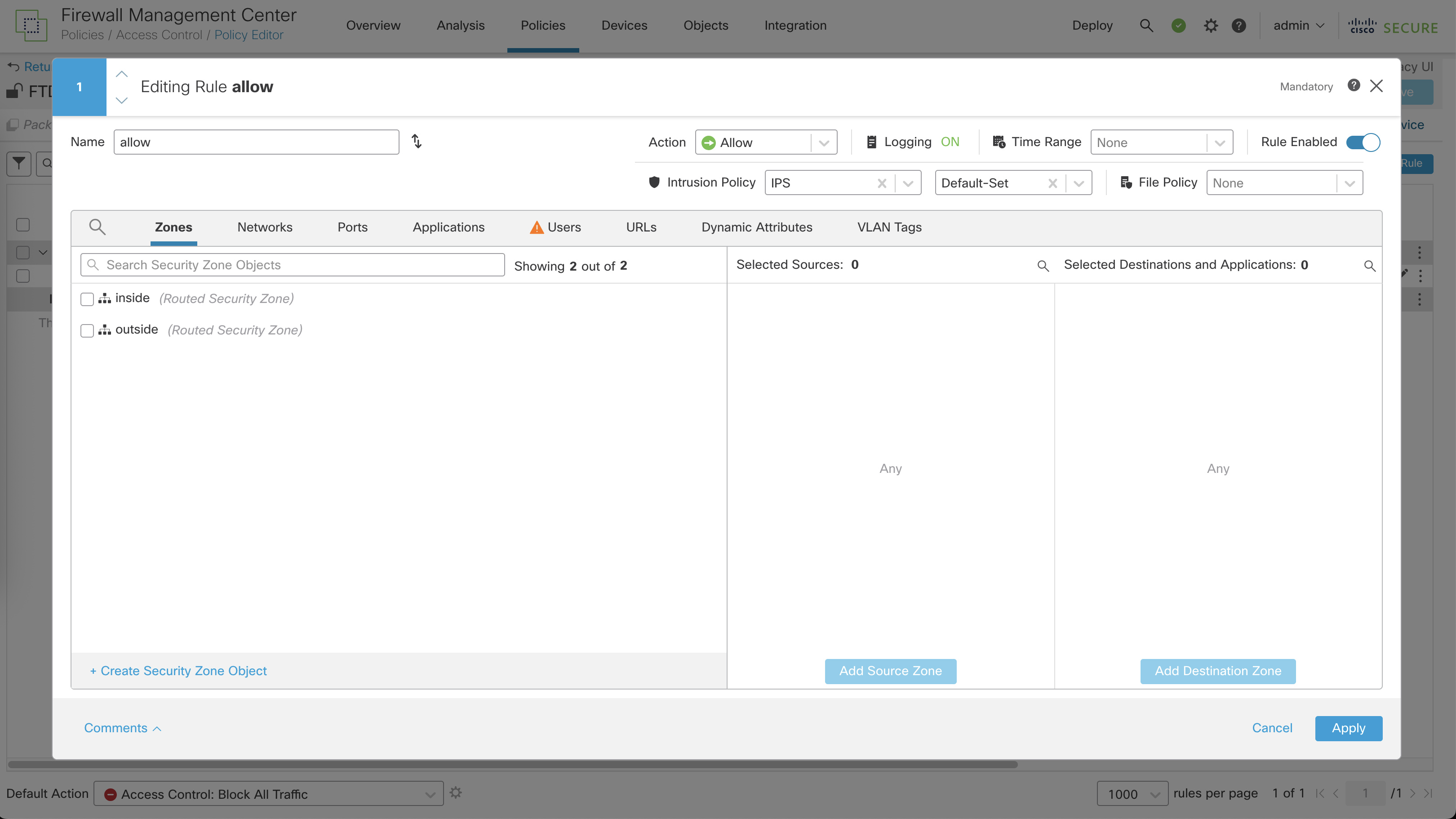 On the FTD side, right now we only have an ‘Allow All’ policy with no IPS/IDS enabled