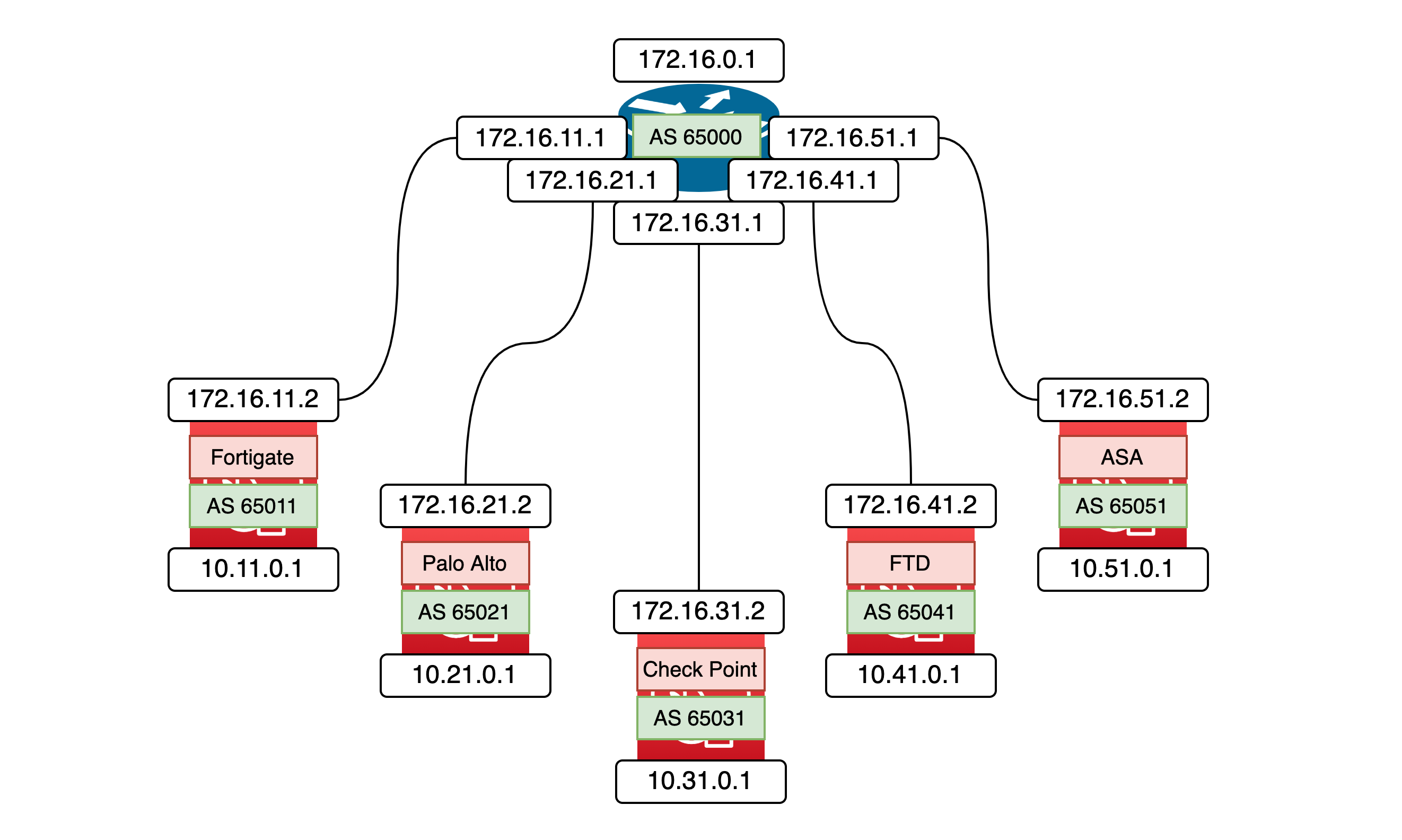Here’s the planned topology for BGP configuration across multiple firewalls