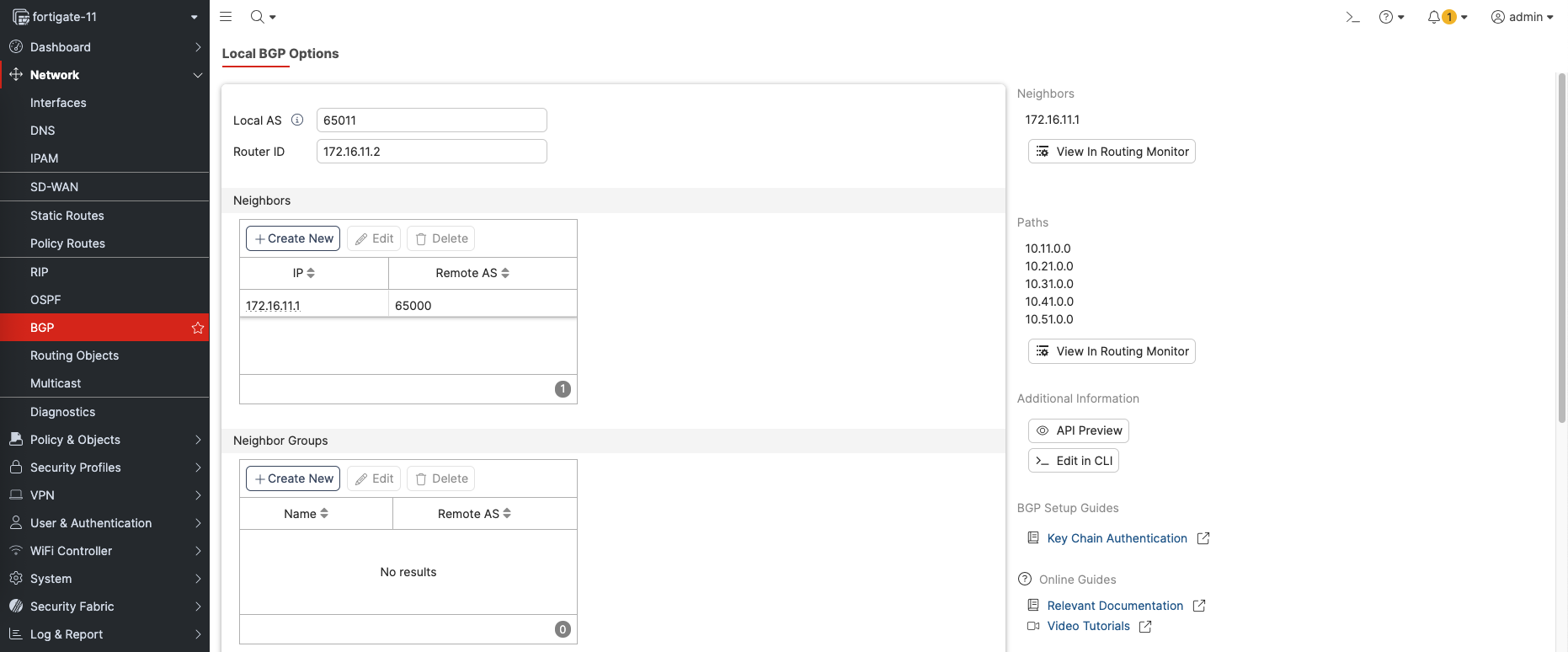 On Forti side, enable BGP by giving it AS Number, Router ID and the BGP Neighbor