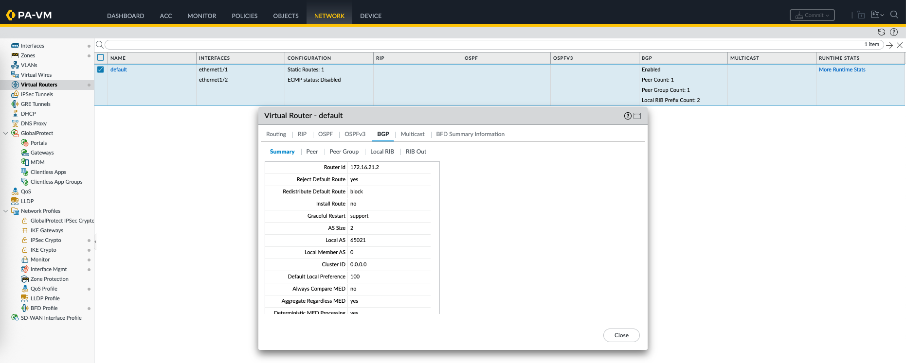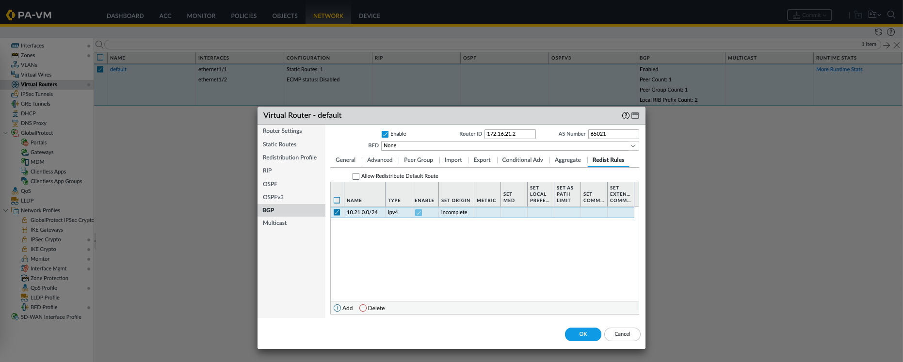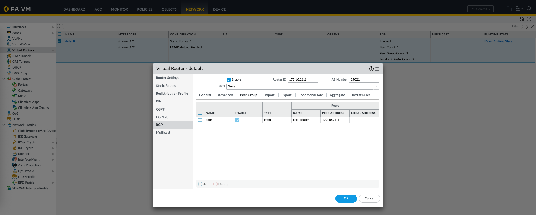 On Palo Alto, we enable BGP on the Virtual Router, here we enable the process, add AS Number, and define the BGP neighbor