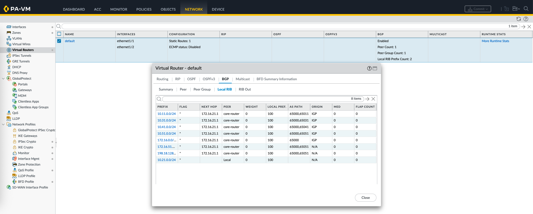 On Local RIB we can see the routes that we receive from BGP