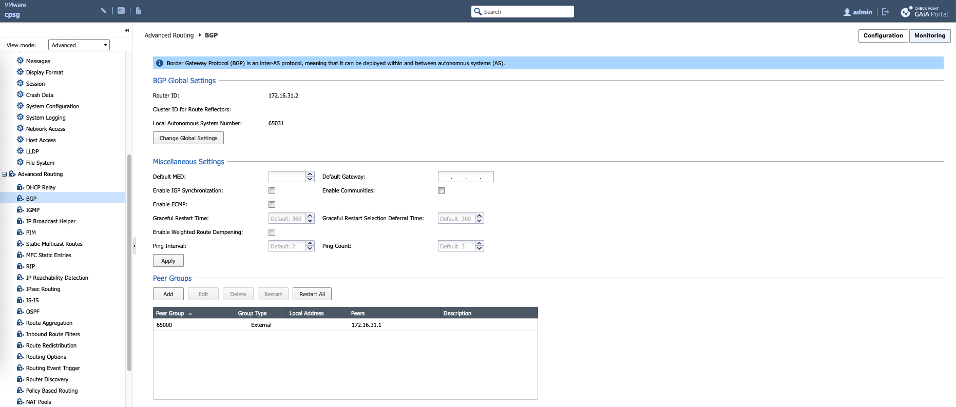 On Check Point, we enable BGP by configuring Router ID, AS Number, and Peer Groups