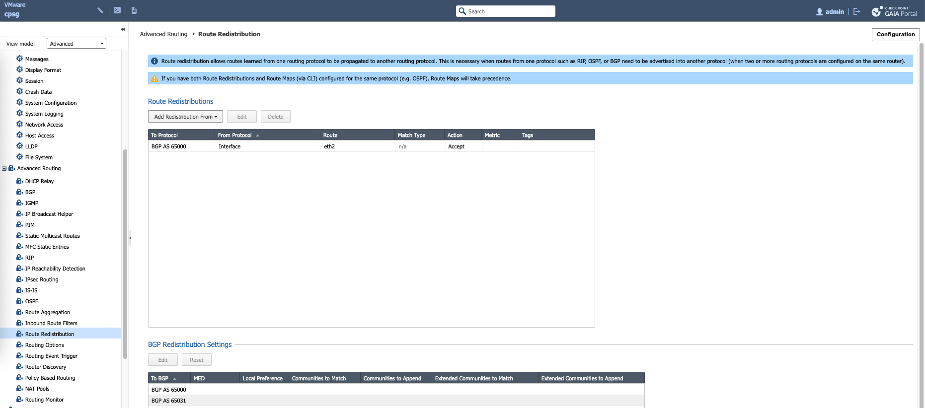 Then on Redist Rules, we add the internal network to advertise