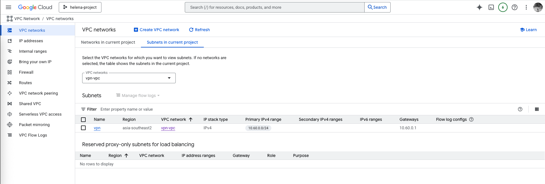 For this lab, we create a new VPN-VPC with subnet 10.60.0.0/24
