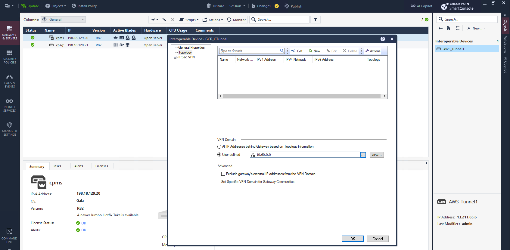 On Topology, here we have to enter GCP’s prefix because this GCP Classic VPN doesn’t use Virtual Tunnel Interface (VTI) but rather an Encryption Domain (Policy Based VPN), where the prefix entered here will decide what destination prefix is sent through the tunnel