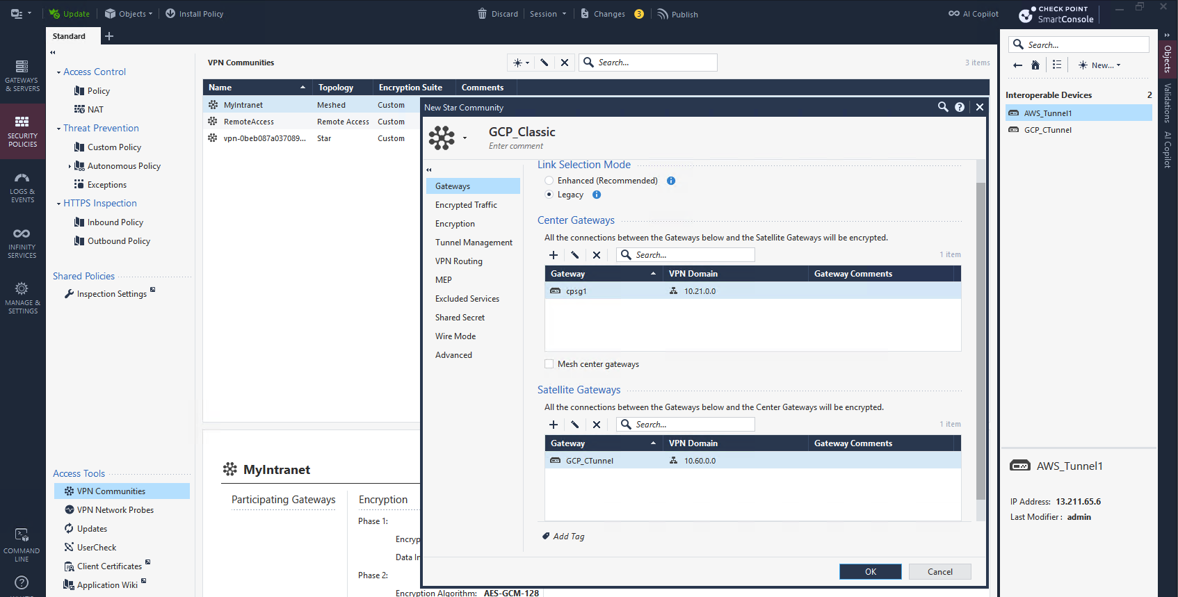 After that we create a Star VPN Community, selecting CP as Center Gateway and GCP as the Satellite Gateway