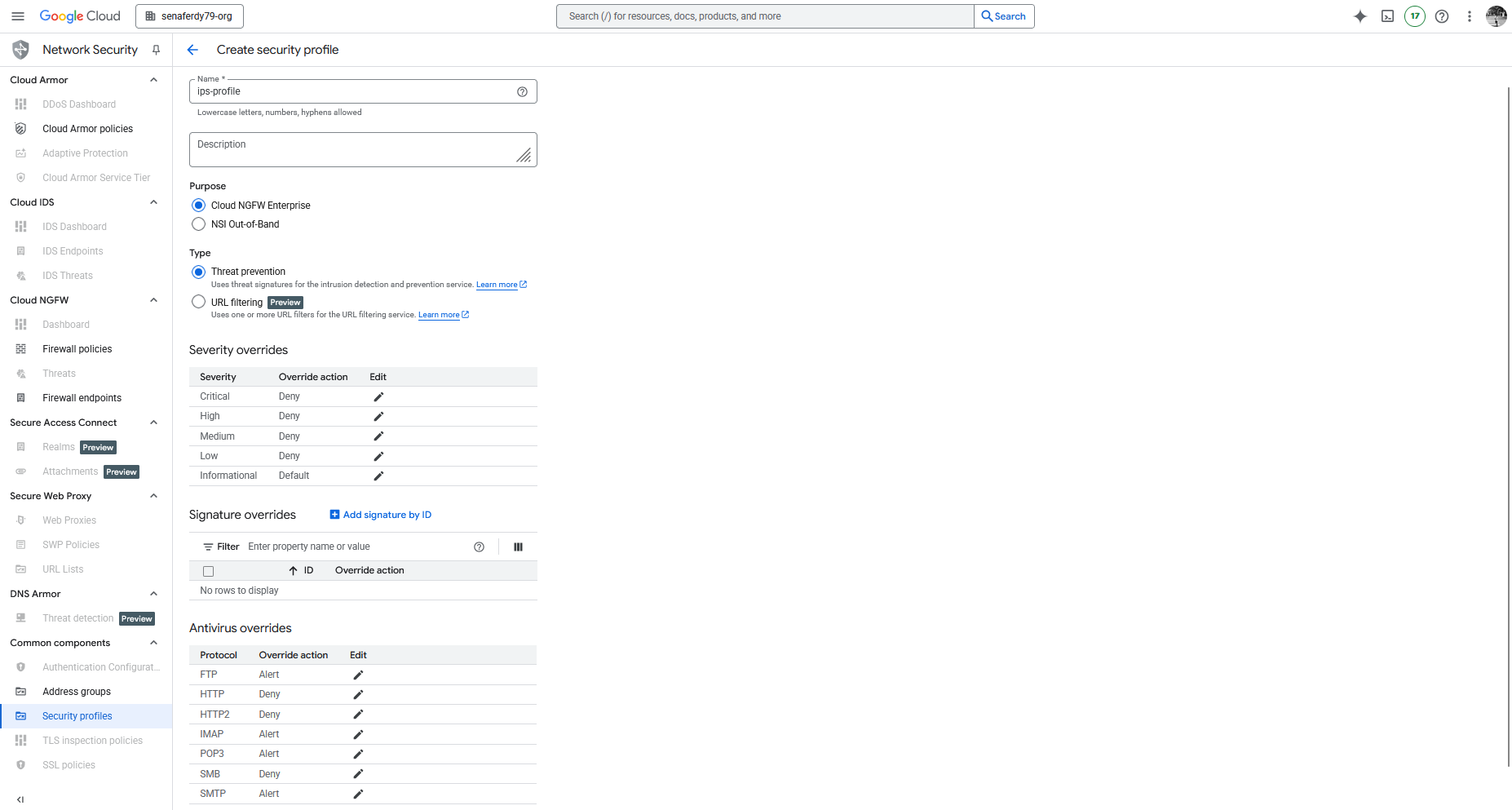First we need to create Security Profiles, first one is for IPS Profile. Here we set the Deny Override for pretty much every alert apart for Informational