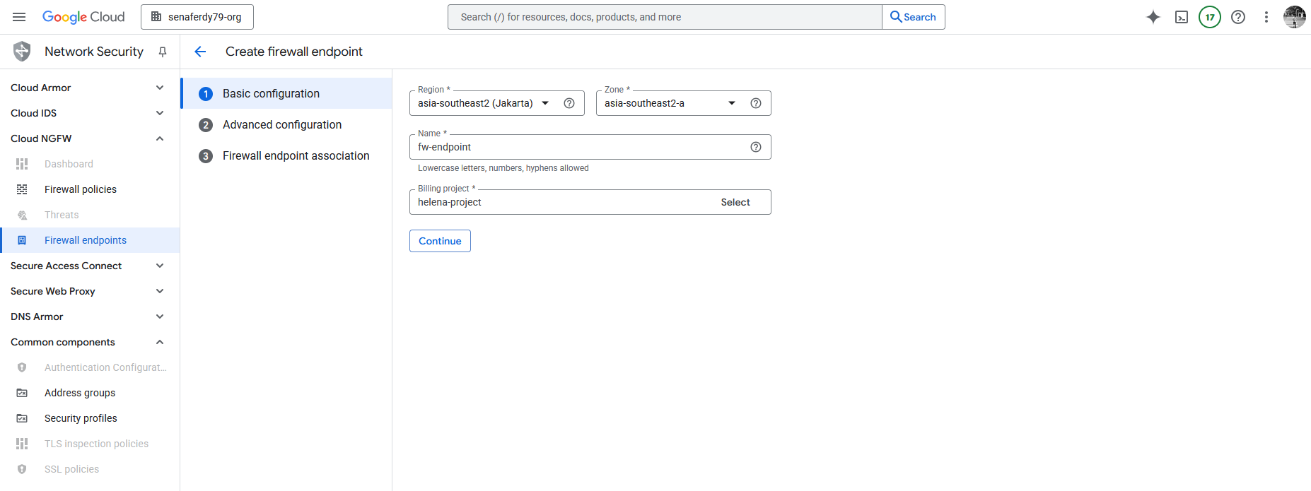 Next we can setup the Firewall Endpoint, here we select the region (FW Endpoint is regional), give it name and select the Billing Project