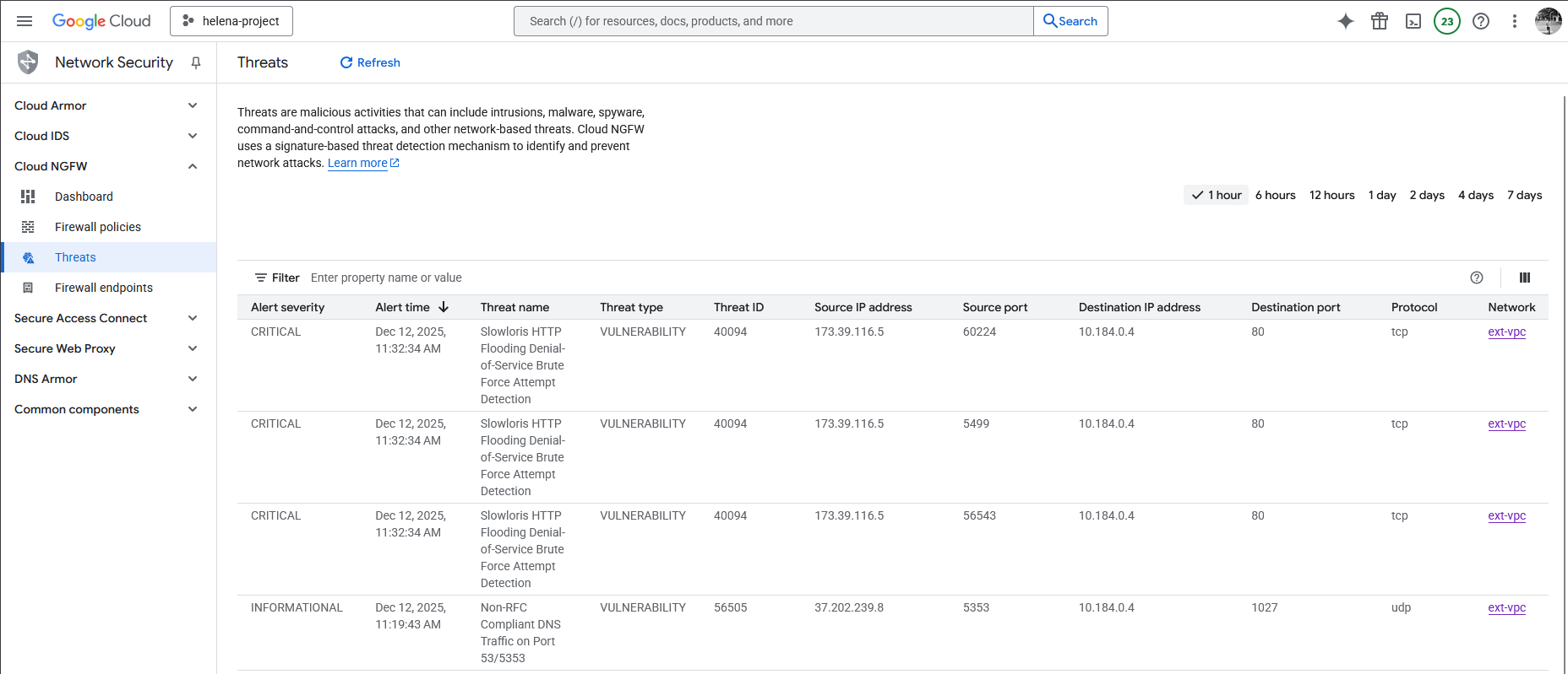 On the GCP Threat Events, we can see that the Firewall Endpoint has successfully identified and prevented this attack