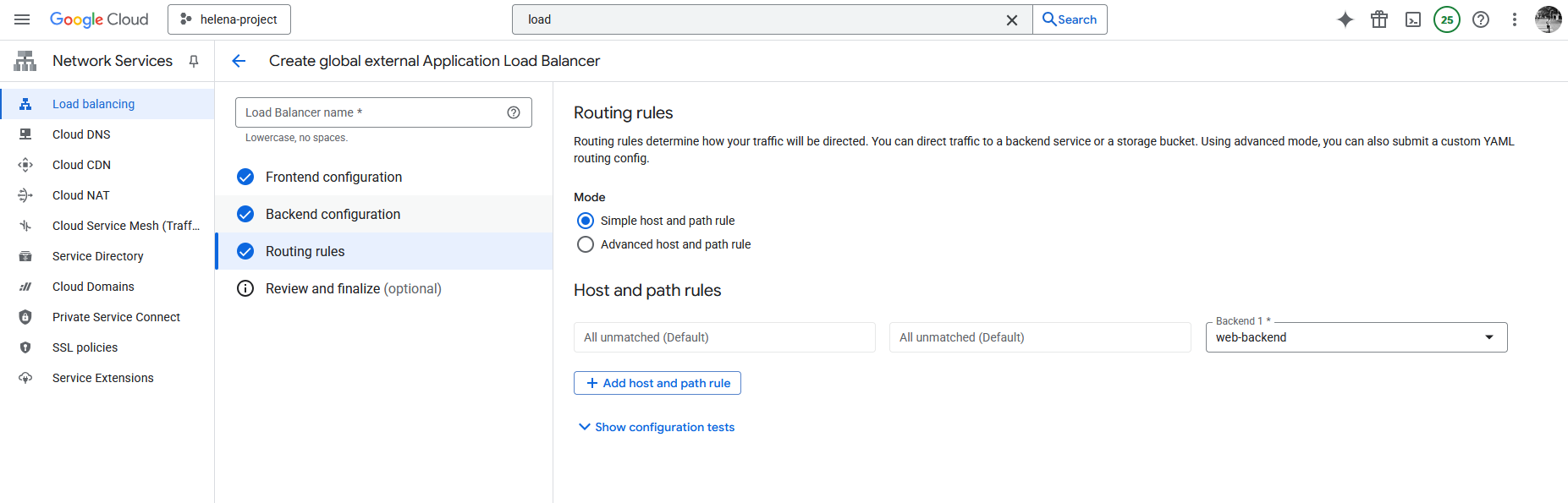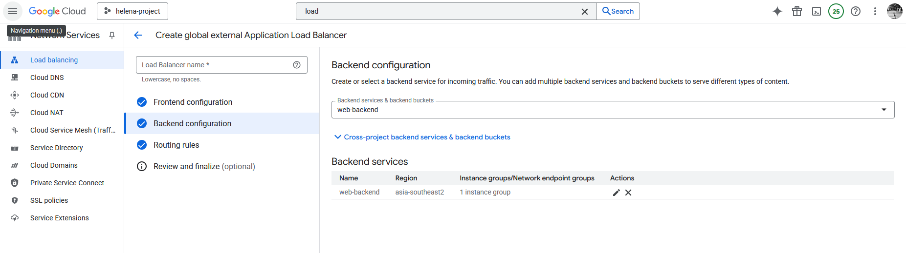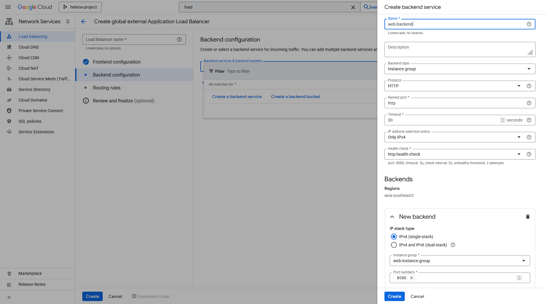 Next we configure the Backend, here we create a new Backend Service that points to the Instance Group we created earlier on port 8080. Here we also disable any Cloud Armor policy because we’ll configure it later.