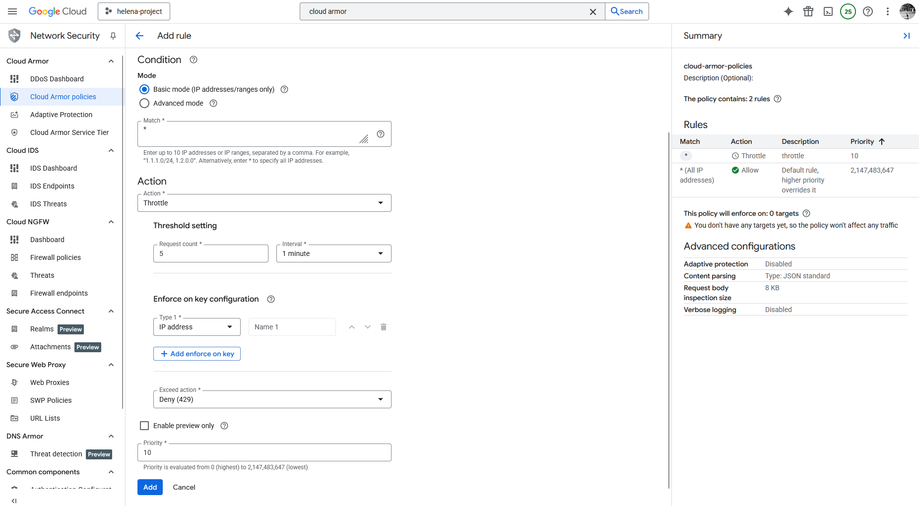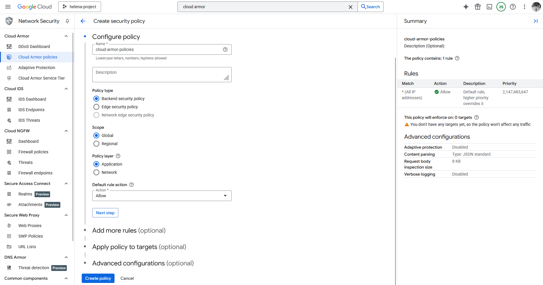 Next we will configure Cloud Armor to better protect our web servers, to do that we’ll create a new Cloud Armor Policy with Backend type at Application Layer