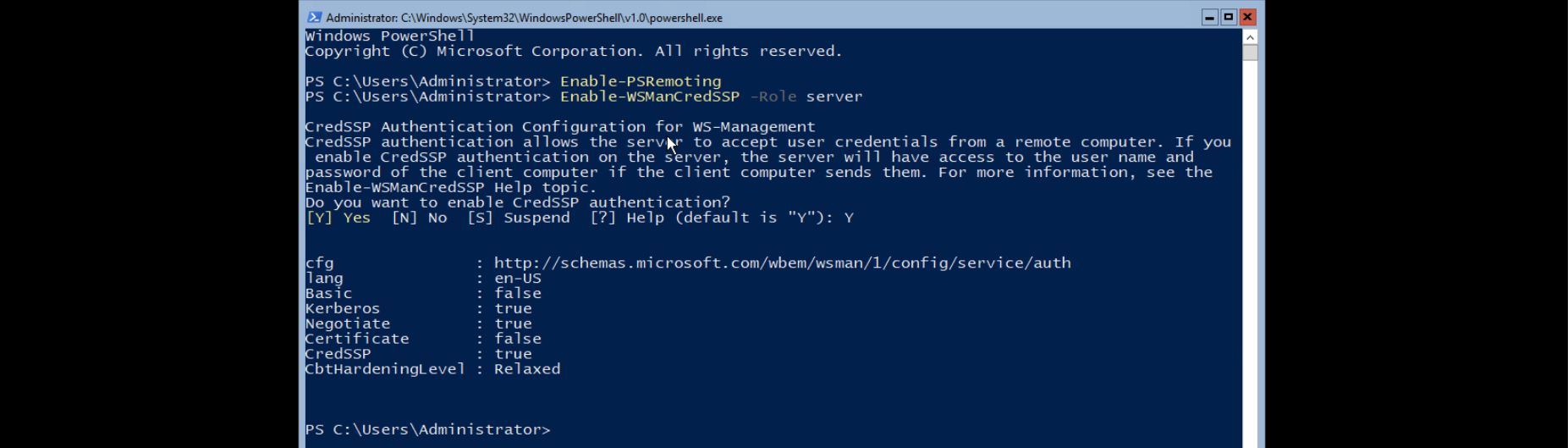 - Enable-WSManCredSSP -Role server : This command enables Credential Security Support Provider (CredSSP) authentication on the server. CredSSP allows the server to delegate a user’s credentials to a remote server for authentication.