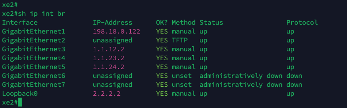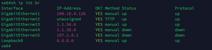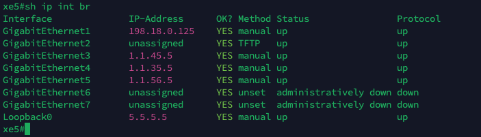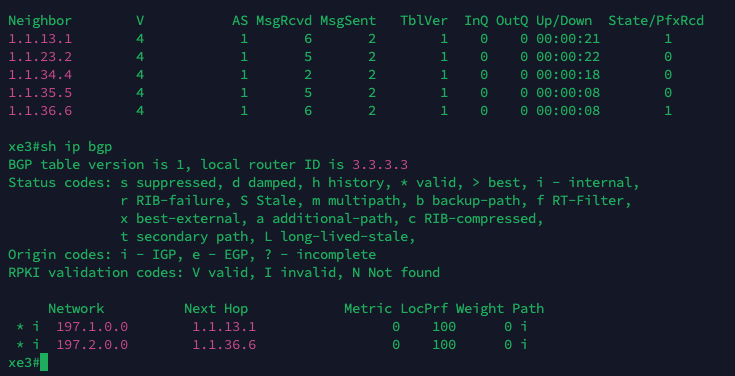 Running “show ip bgp summary” on xe3, we can see it now has neighborship to all routers, and it also has learned the advertised network on xe1 and xe5 because they’re only one hop away