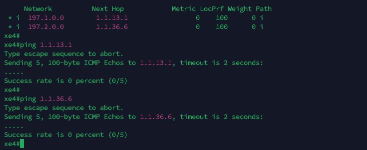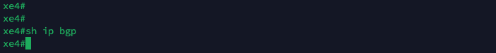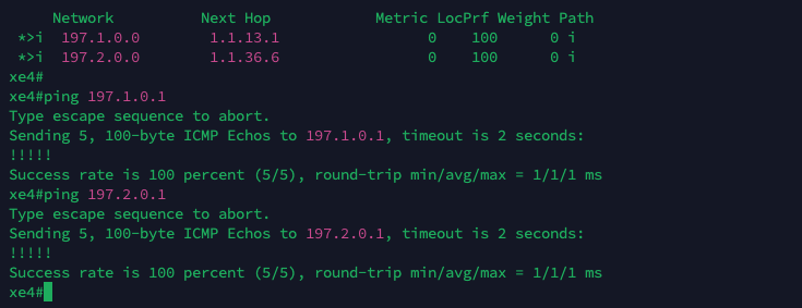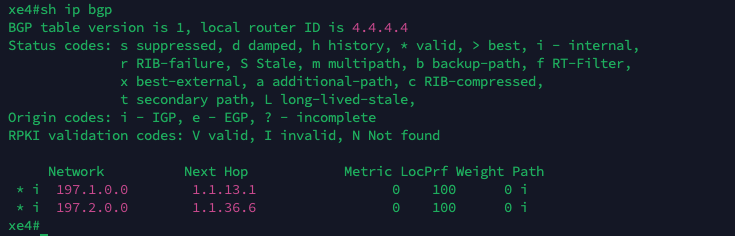 But by design, iBGP will only advertise network to one next hop router, which can be seen here on xe4 where it still doesn’t know the existence of the 197.1.0.0/24 network