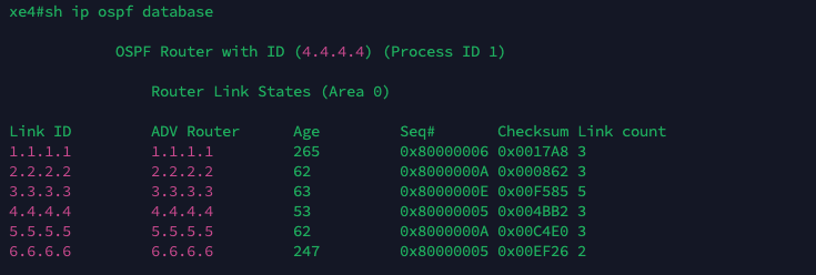 We still have one problem, on xe4 if we see the advertised networks, the next hop is the address original router who advertised the network (xe1 and xe6), which xe4 doesn’t have the route to reach them