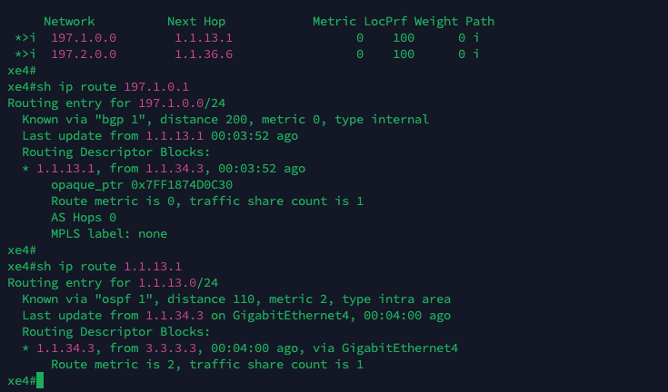 If we dive more on the routes used, we can see that xe4 learns the 197.1.0.0/24 network from BGP, but in order to get to the next hop which is on xe1, it uses OSPF to learn the route