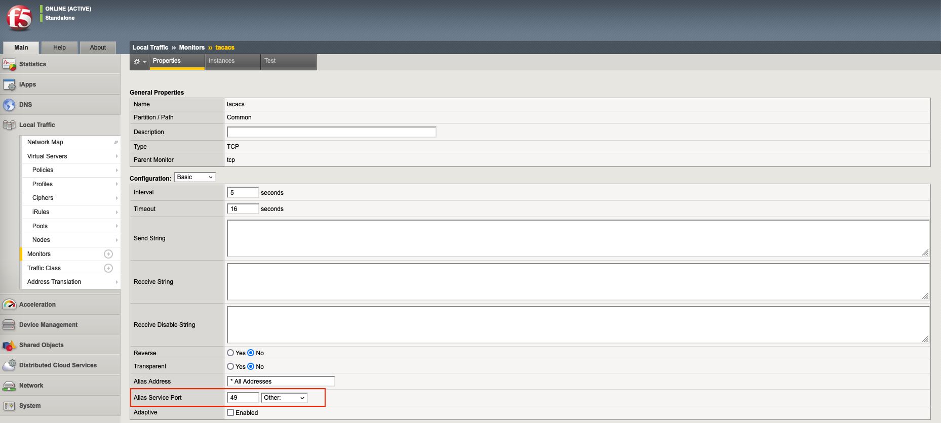 First lets configure a new Health Monitor to monitor the ISE’s tacacs service on port 49, on Local Traffic » Monitors create a new one