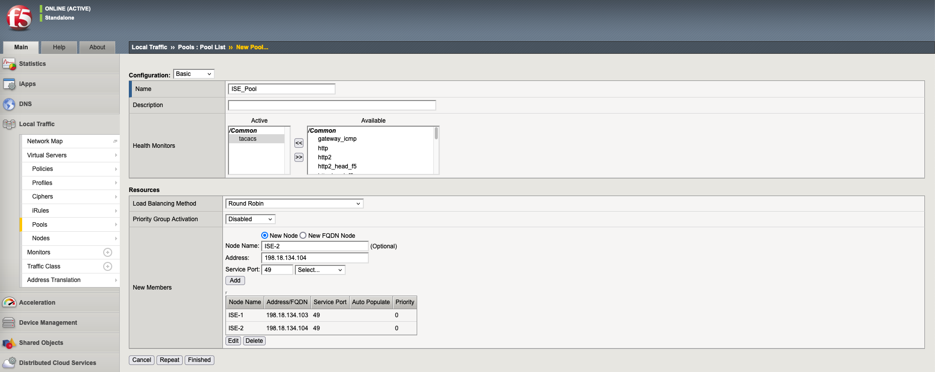 Next create a Pool containing the 2 ISE Servers with service port on port 49 and using the Health Monitor created