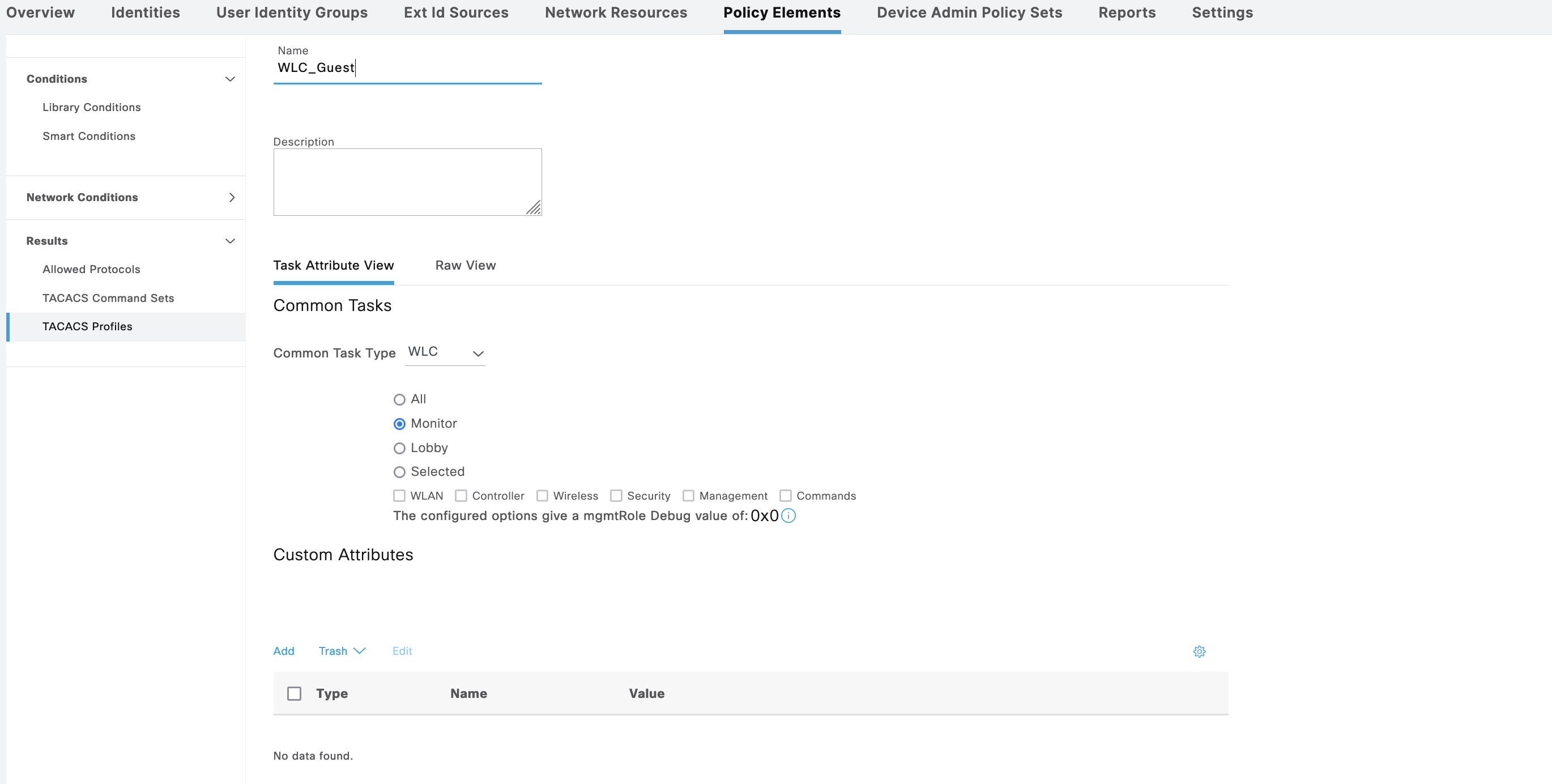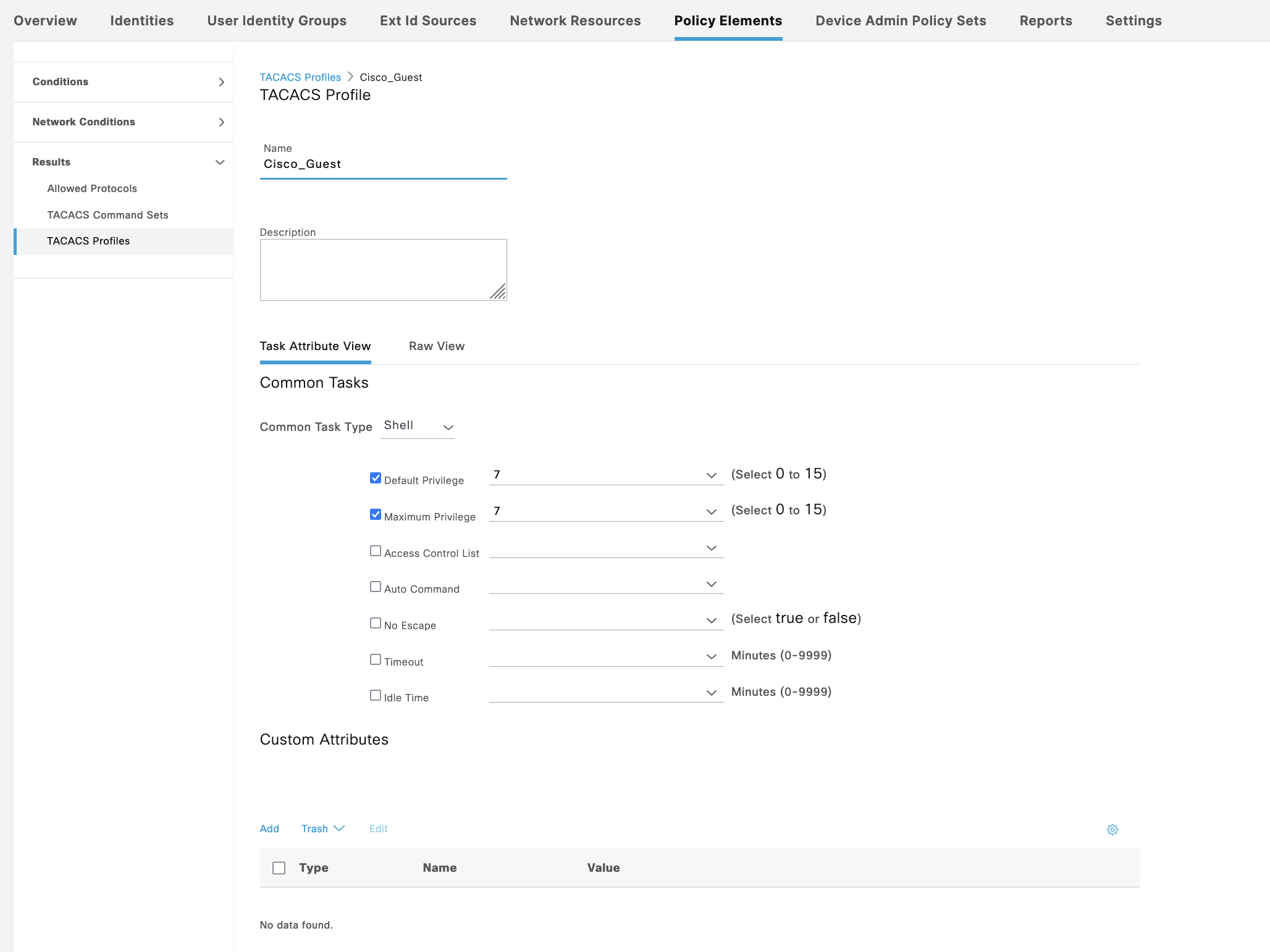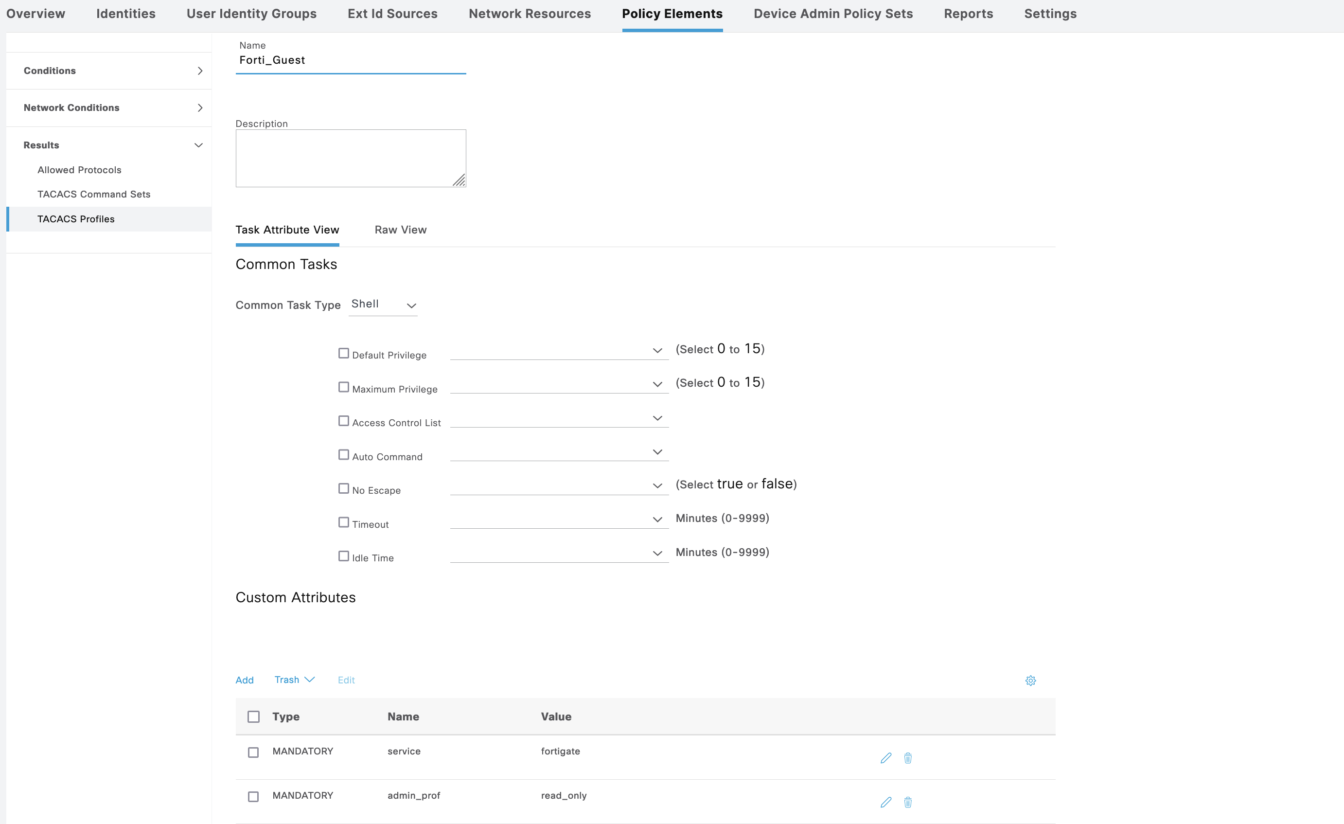On Policy Elements » TACACS Profile, create 2 profiles for Admin and Guest