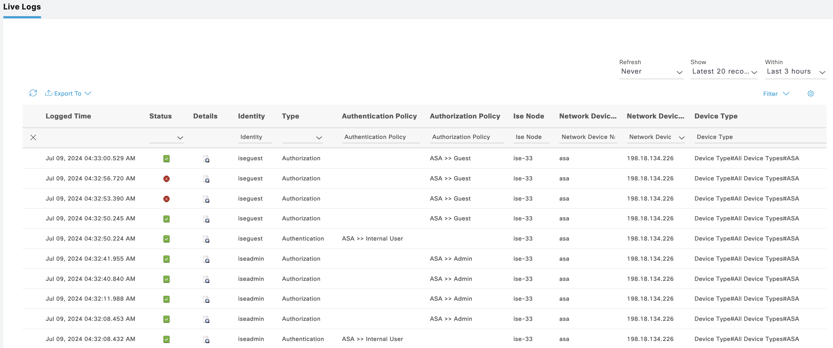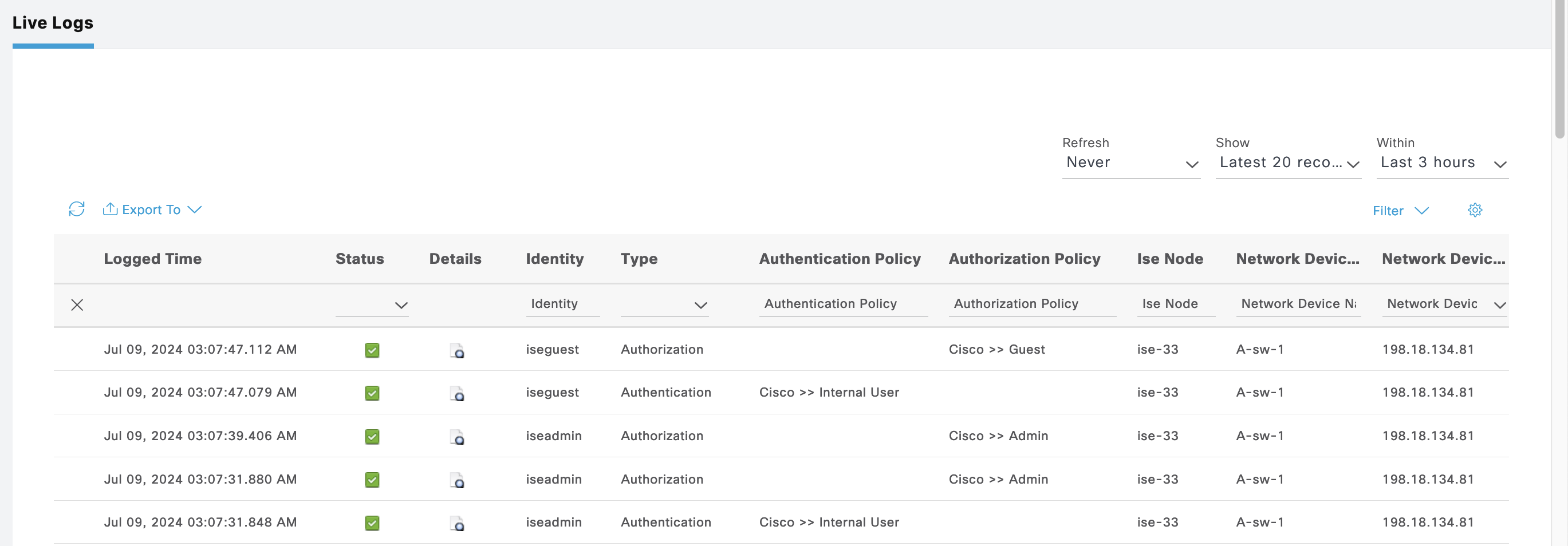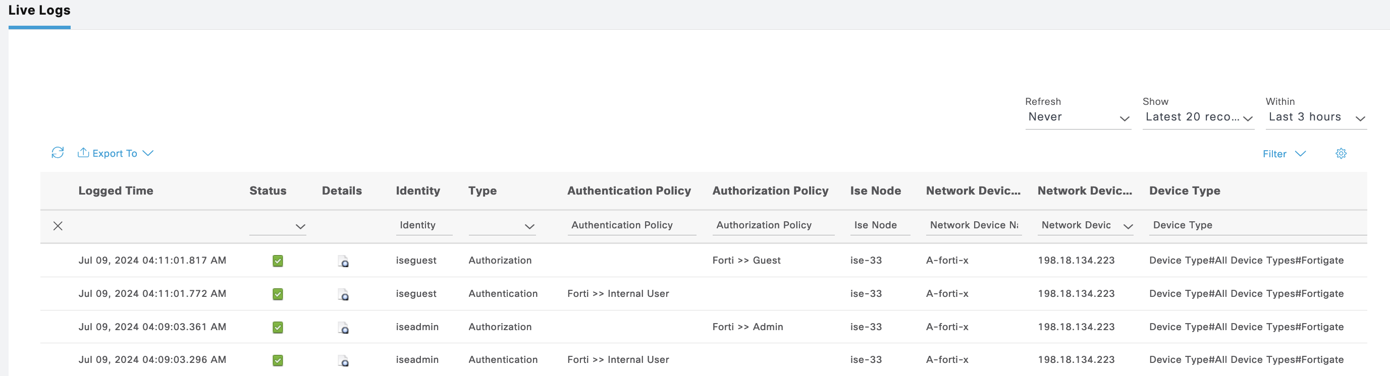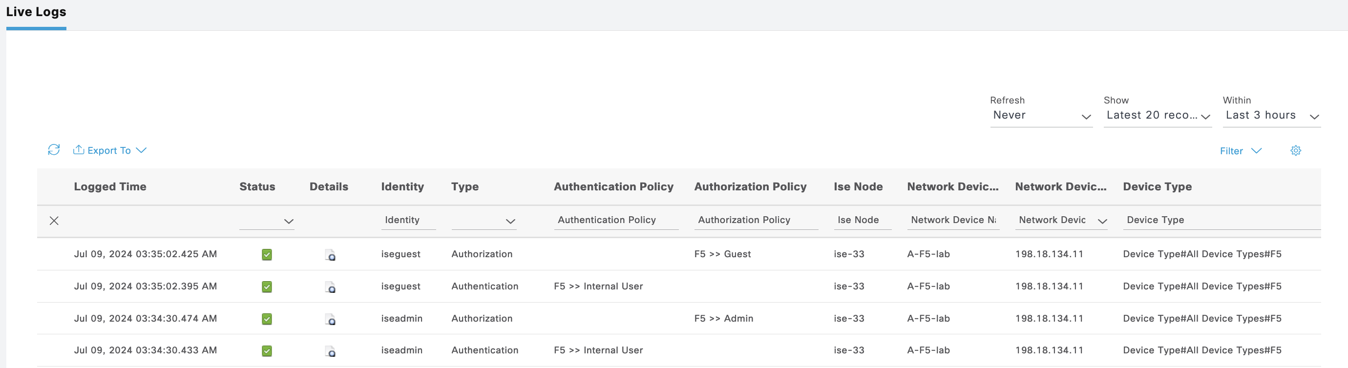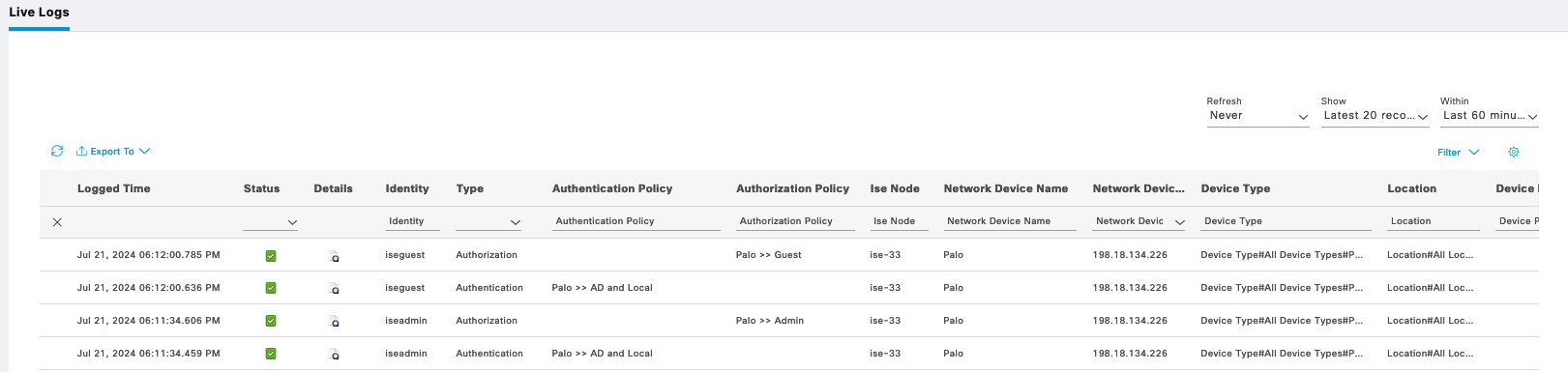 ISE Live Logs shows these users authenticating to ISE
