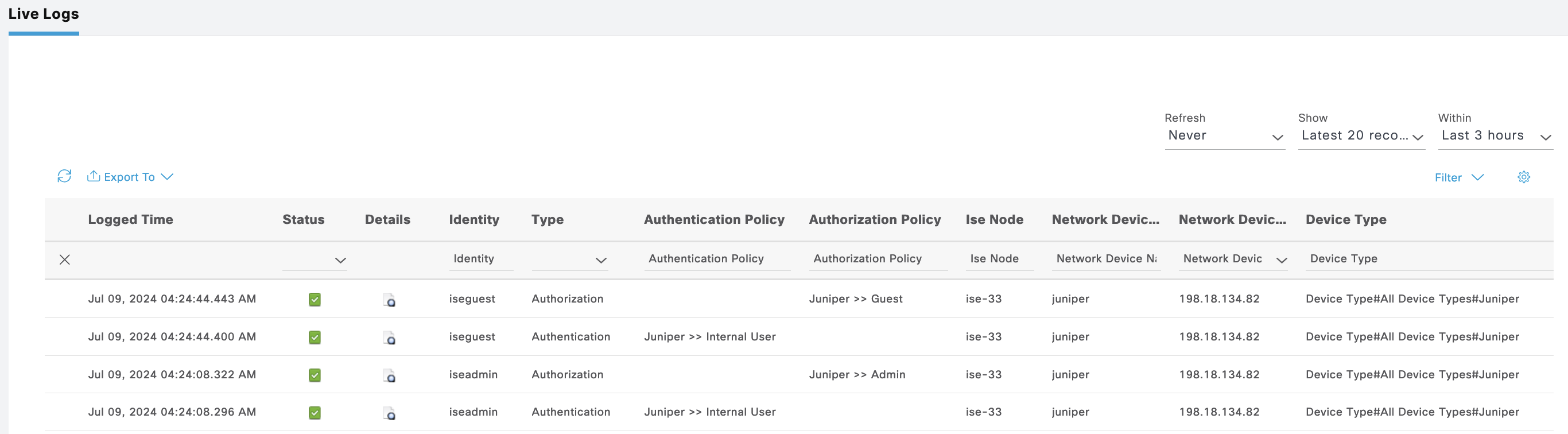 The ISE Live Logs shows the authentication made by these 2 users on Juniper