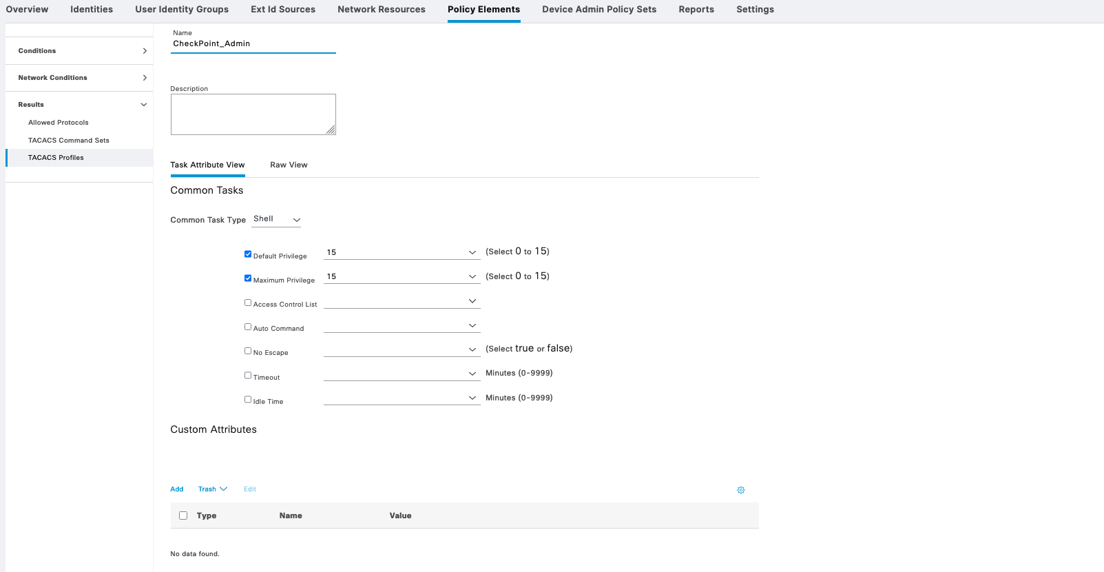 On the Checkpoint, on User Management » Roles, create a new role named “TACP-0” with only “TACACS_Enable” feature. This will be the default access for any user authenticating through tacacs, where then this user will be able to escalate the privile to TACP-15 through “tacacs_enable” if their permission allows
