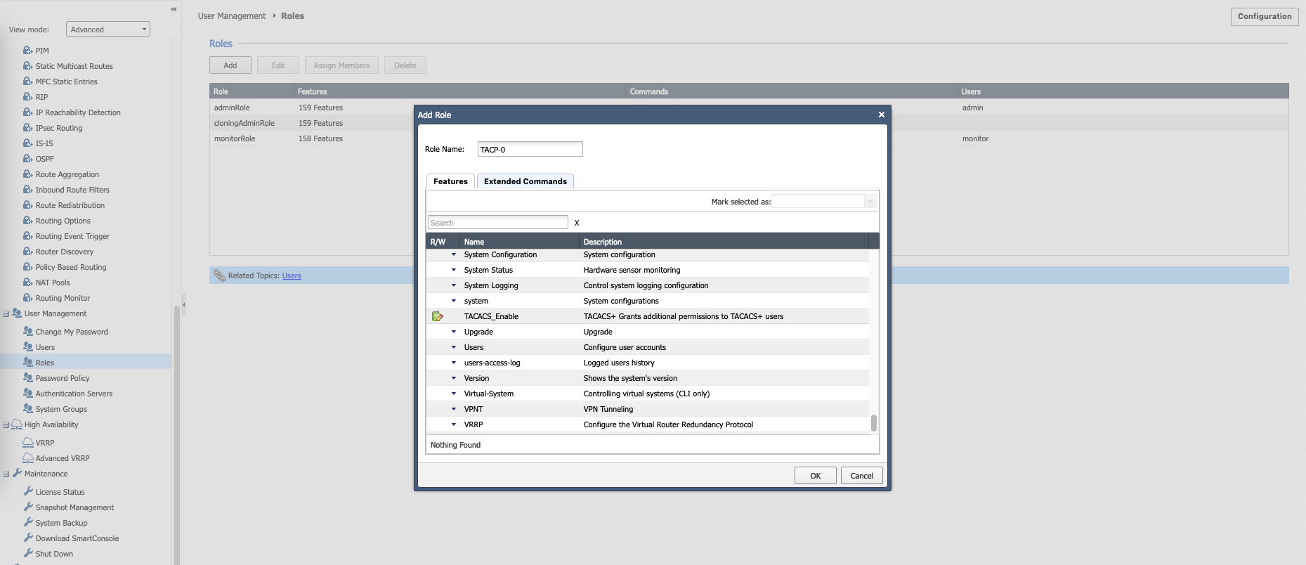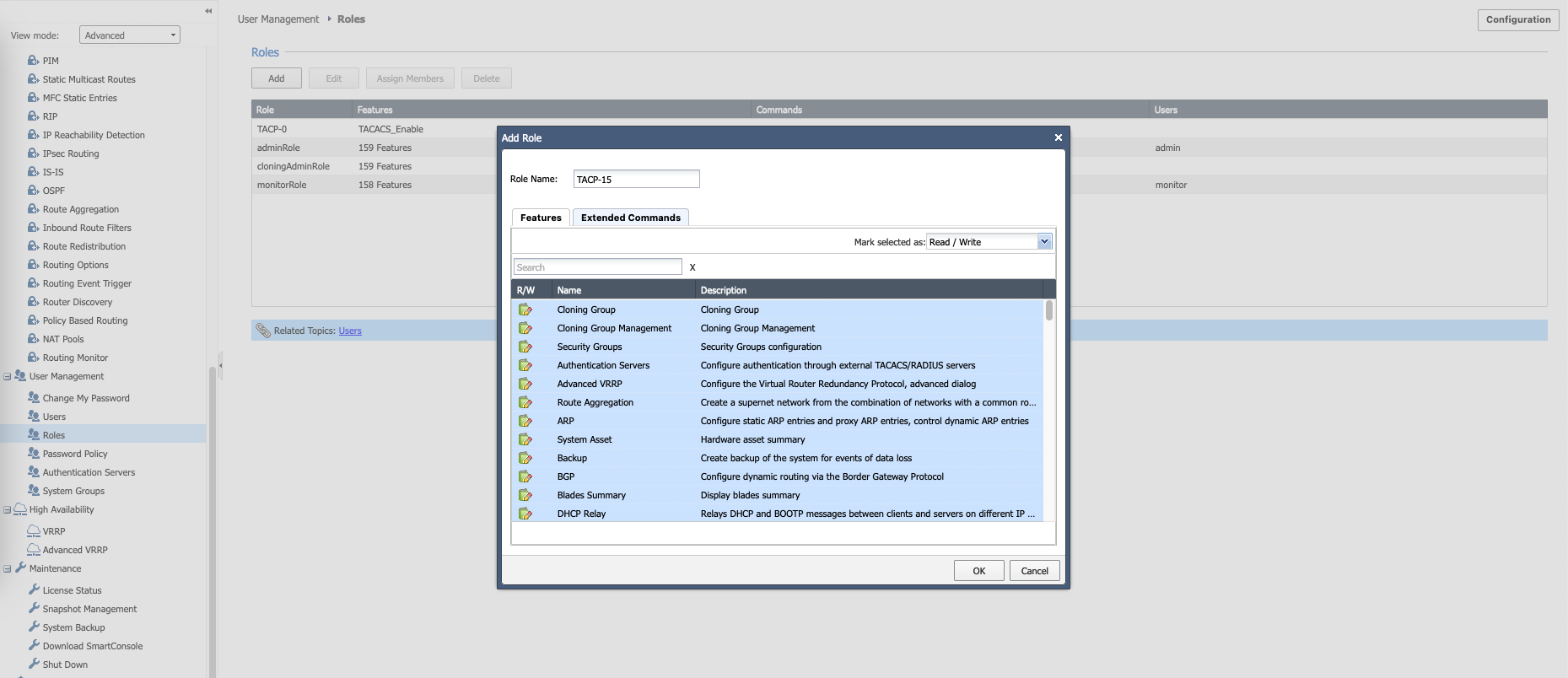 Then create another role named “TACP-15” with all features and commands checked. This will be the full fledged super admin user that can access basically everything