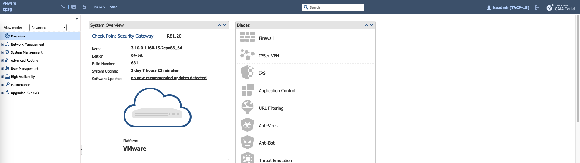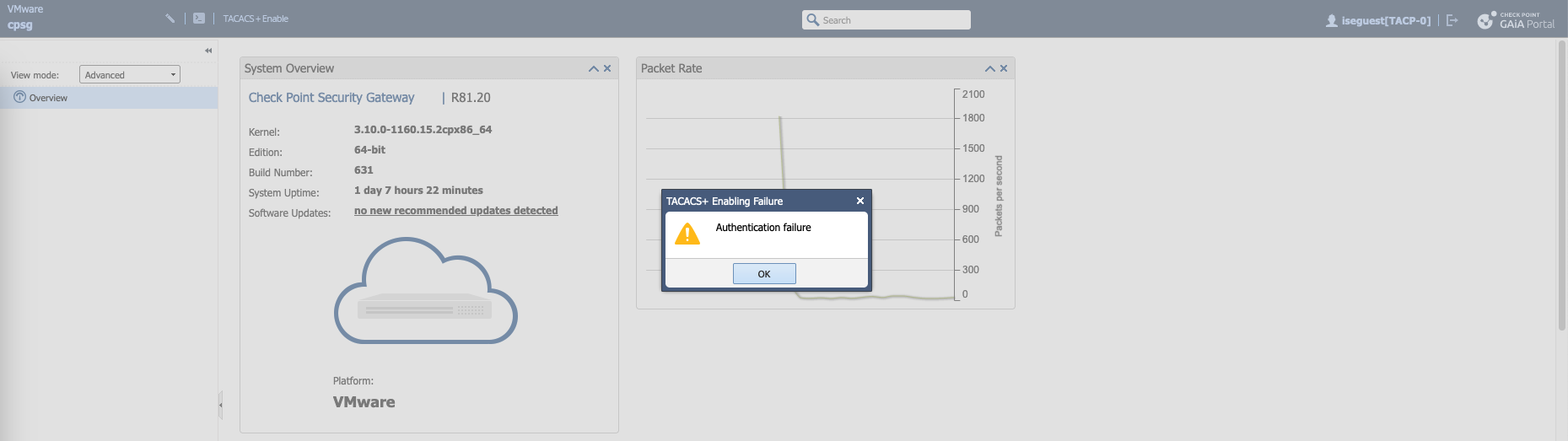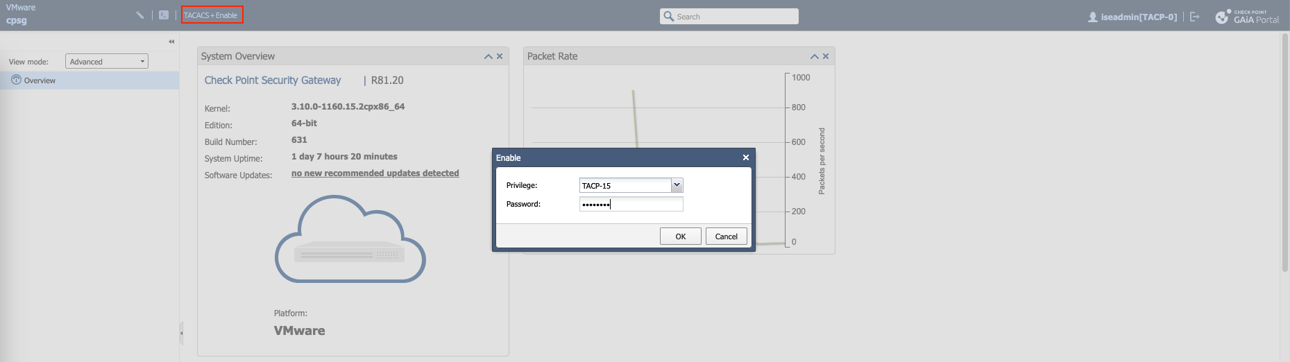 Now if we login with iseadmin, we’ll be given TACP-0 role by default, which we can escalate by clicking TACACS+ Enable