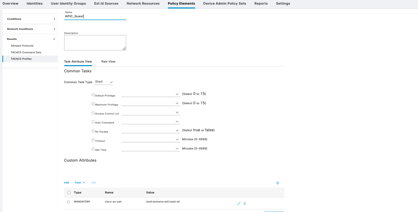 Whereas APIC_guest contains custom attribute “cisco-av-pair=shell:domains=all//read-all” to only give read-only permission