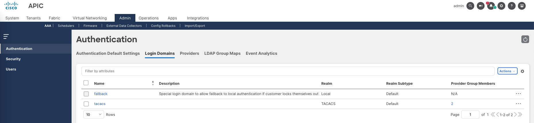 APIC_Admin contains custom attribute “cisco-av-pair=shell:domains=all/admin/” to give it full permission