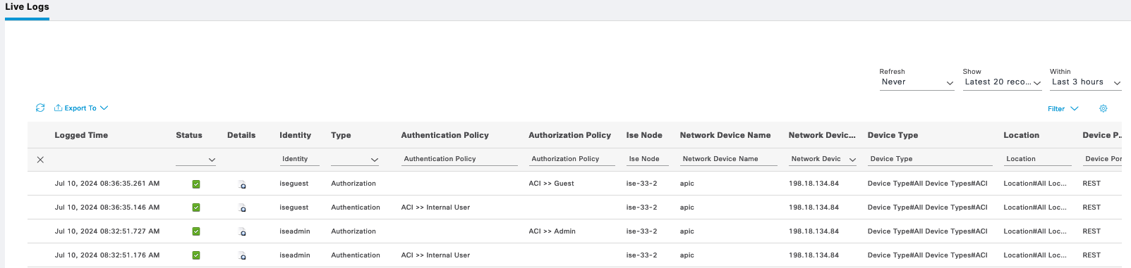 And all the authentication logs can be viewed on Cisco ISE Tacacs Live Logs