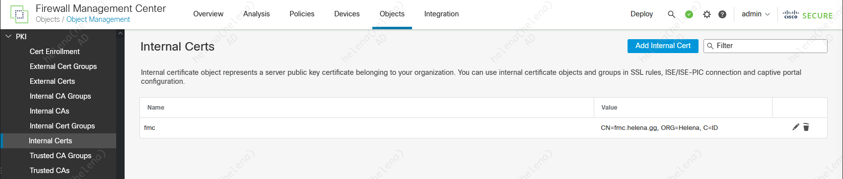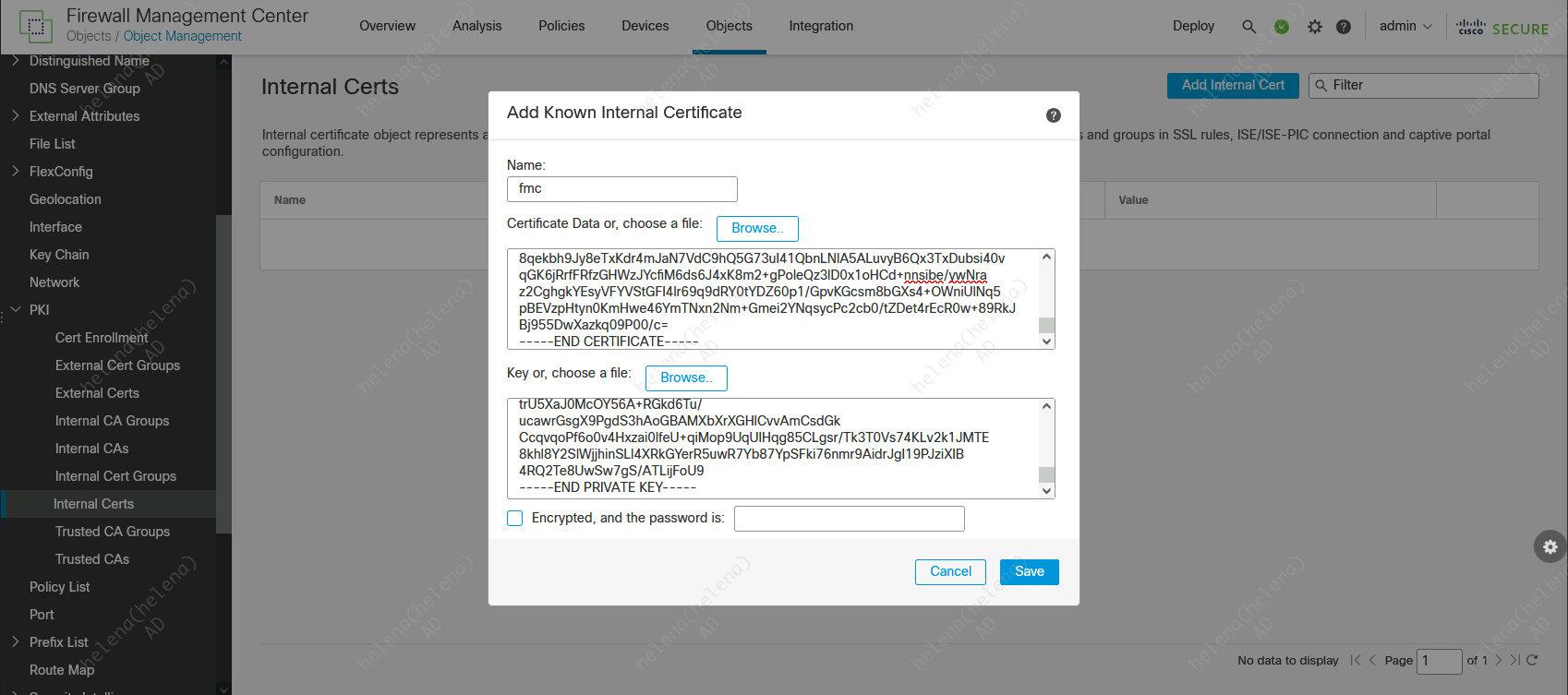 Next on Internal Certs, import the Certificate and Private Key for FMC