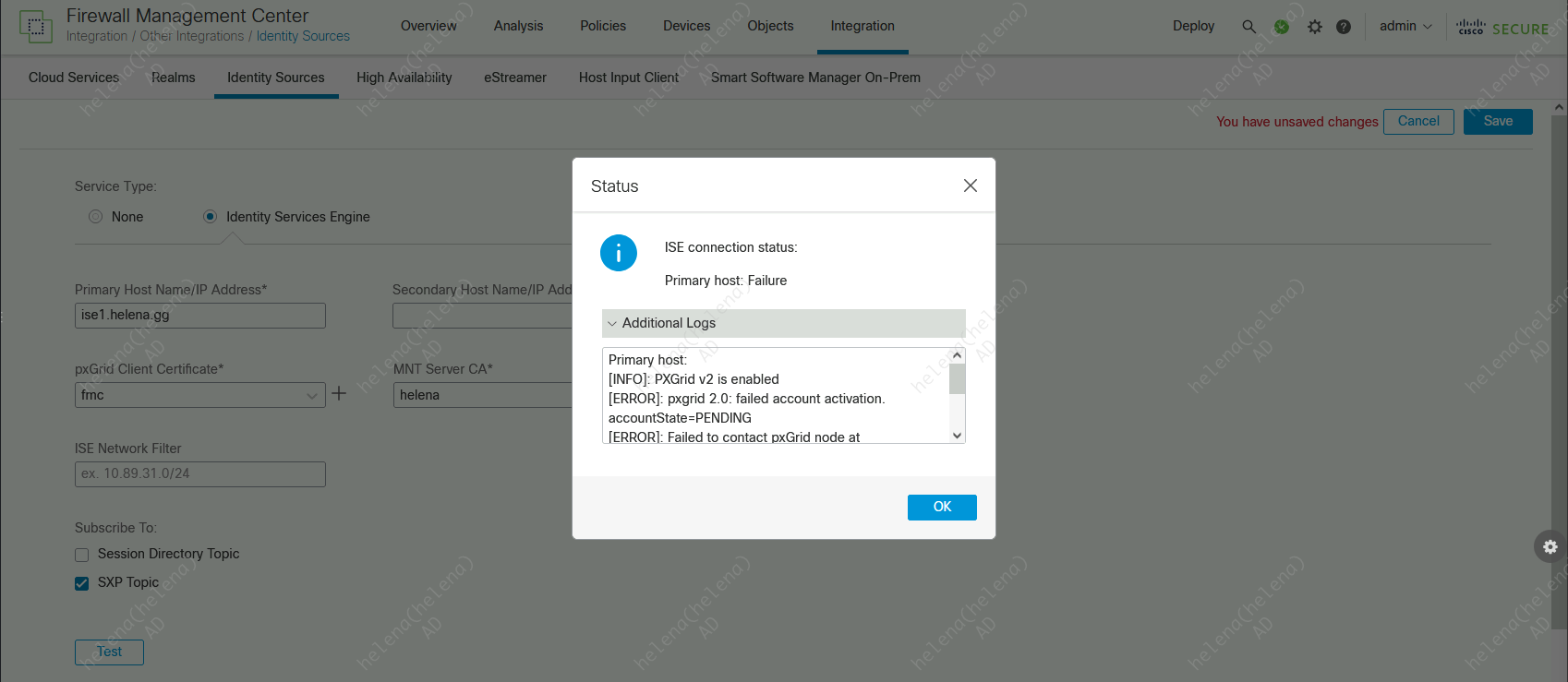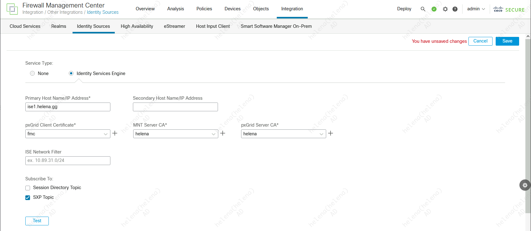 On FMC » Integration » Identitiy Sources, select ISE and fill in the details