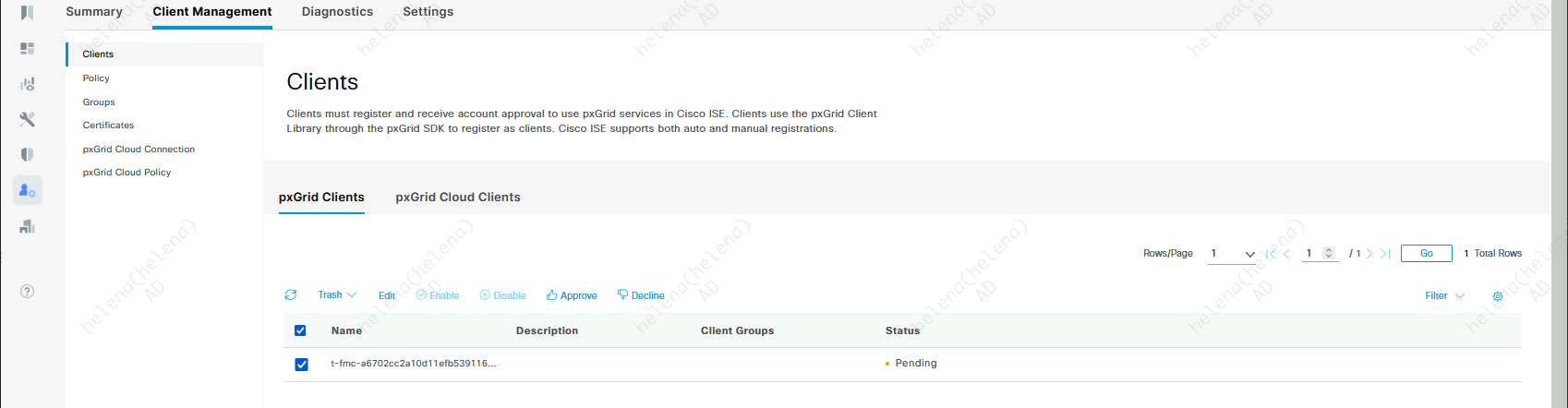 Go to ISE » Administration » Client Management » PxGrid Clients, hit approve on the pending client